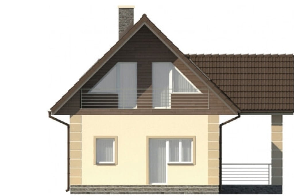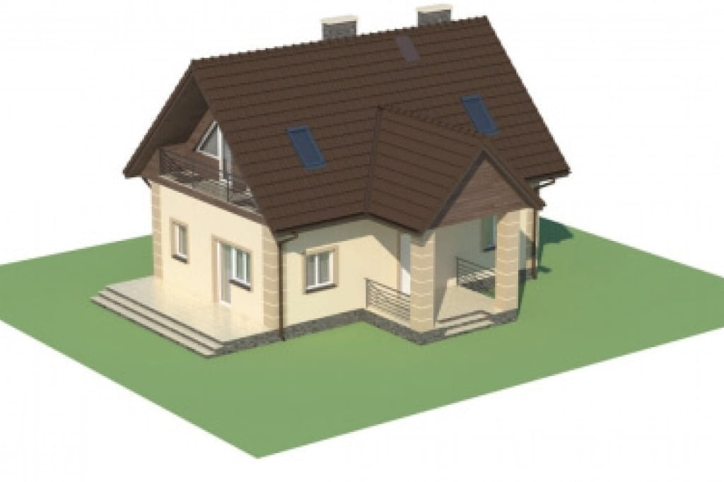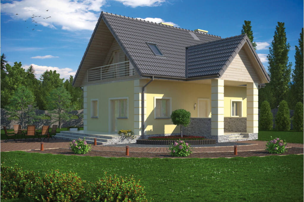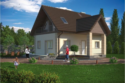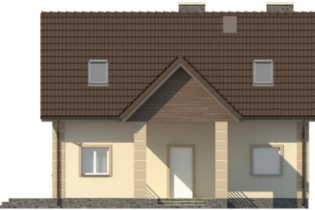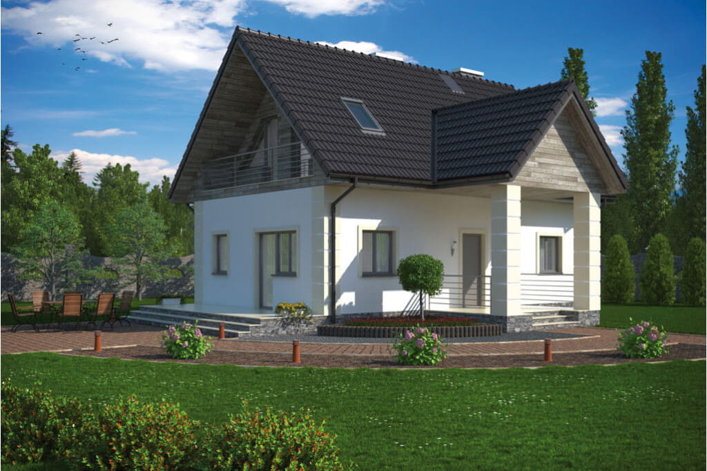 Zwarta bryła obiektu zapewnia energooszczędność domu, a prosta konstrukcja szybką i bezproblemową budowę. Konstrukcję urozmaica nieco wprowadzenie zadaszenia nad głównym wejściem, które wsparte zostało na dwóch kolumnach. Daszek nadaje budynkowi dodatkowego uroku, a jednocześnie jest bardzo praktyczny.