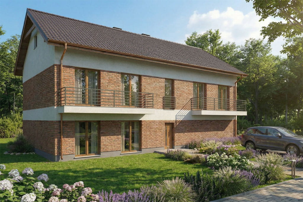 Powierzchnia użytkowa: 261.12 m². Budynek piętrowy z poddaszem nieużytkowym, jednorodzinny, niepodpiwniczony, z garażem dwustanowiskowym.