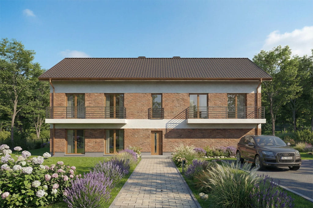 Budynek piętrowy z poddaszem nieużytkowym, jednorodzinny, niepodpiwniczony, z garażem dwustanowiskowym.
