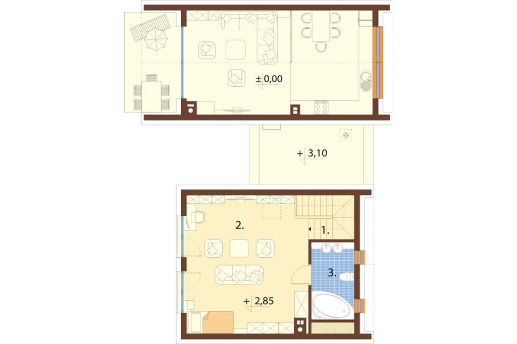 Program: wiatrołap, salon, kuchnia, pokój, 2 łazienki, kotłownia. Na poddaszu otwarta przestrzeń do aranżacji.