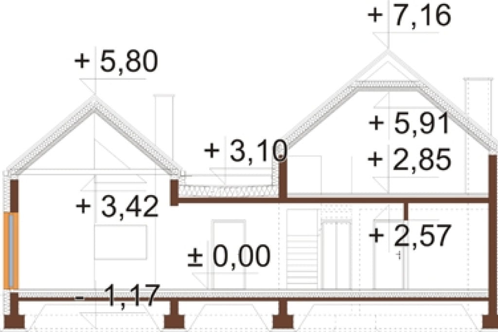 Budynek jednorodzinny parterowy z poddaszem użytkowym, niepodpiwniczony, bez garażu. Zaprojektowany w technologii tradycyjnej z dachem skośnym o symetrycznym nachyleniu połaci. Dom przeznaczony dla 4-6 osób.