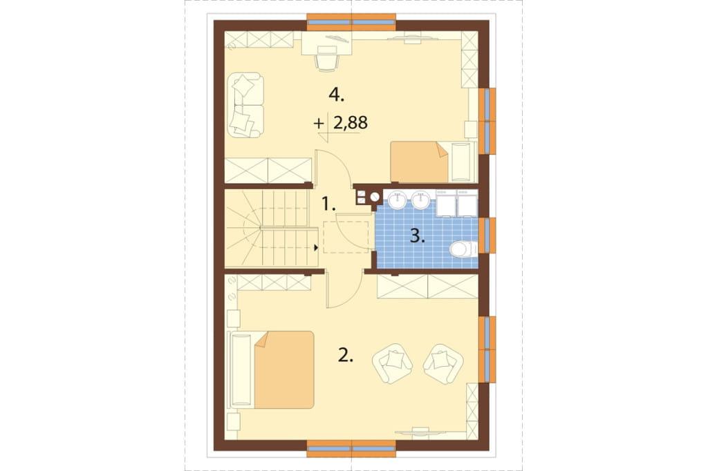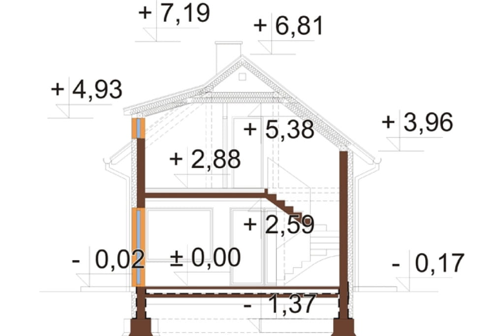 Budynek jednorodzinny parterowy z poddaszem użytkowym, niepodpiwniczony, bez garażu. Zaprojektowany w technologii murowanej z dachem dwuspadowym. Dom przeznaczony dla 2-6 osób.