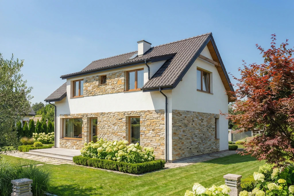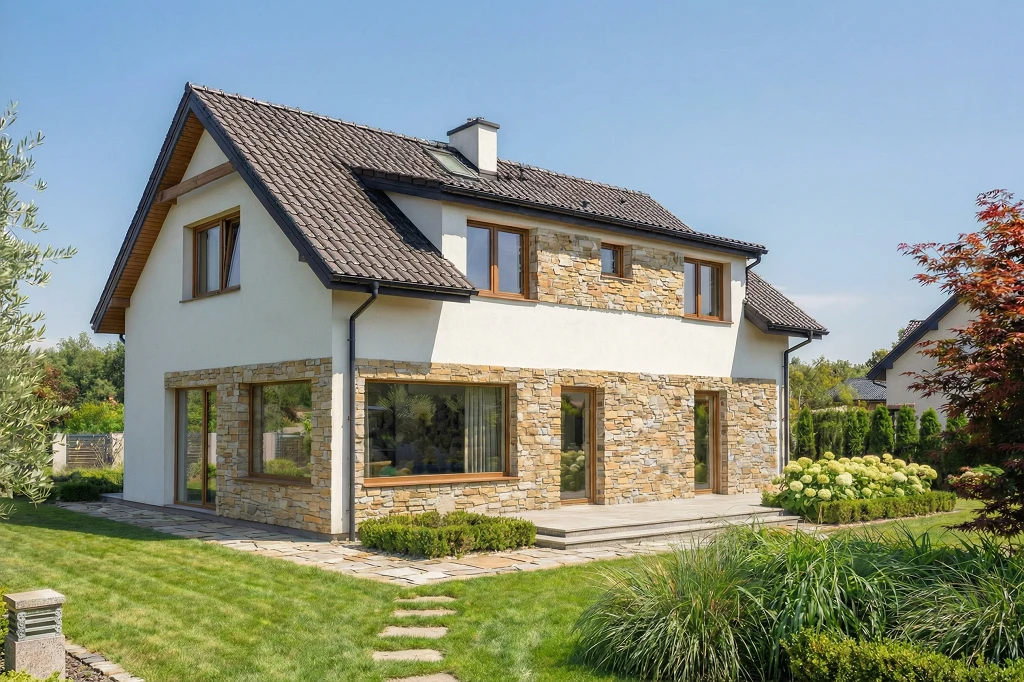 Ściany zewnętrzne: pustak silikatowy 24 cm, styropian 15 cm, tynk cienkowarstwowy