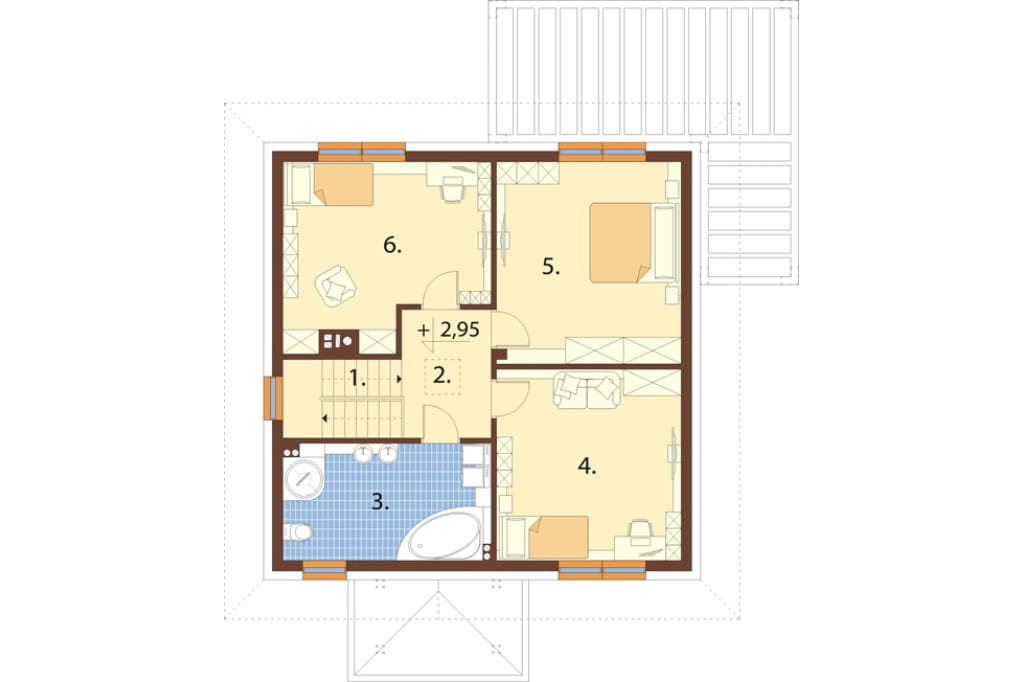 Budynek jednorodzinny piętrowy, niepodpiwniczony, bez garażu. Zaprojektowany w technologii murowanej z dachem czterospadowym. Dom przeznaczony dla 4-6 osób.