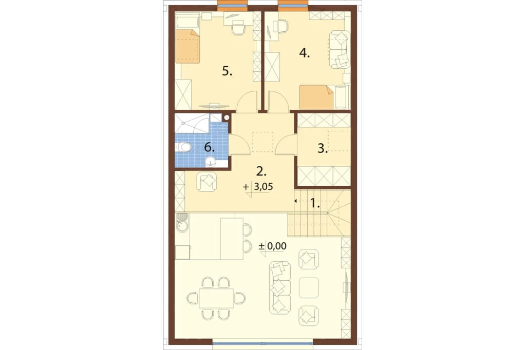 Program: wiatrołap, salon z aneksem kuchennym, 3 pokoje, 2 łazienki, pom gospodarcze, 2 garderoby, antresola.