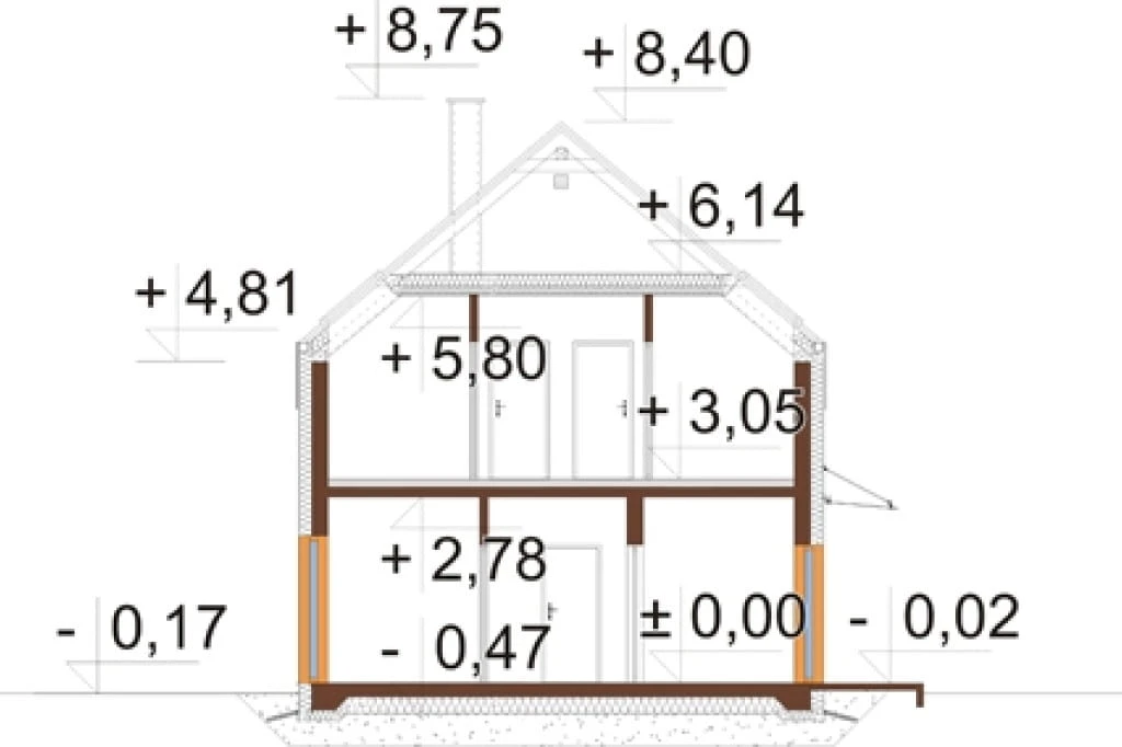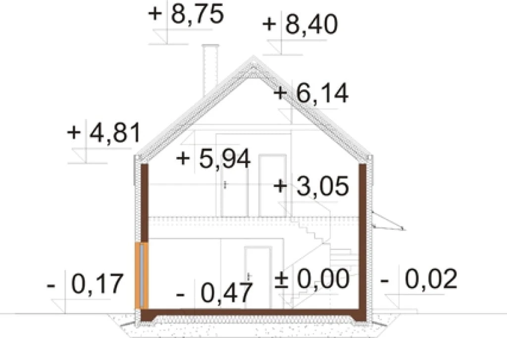 Budynek jednorodzinny parterowy z poddaszem użytkowym, niepodpiwniczony, bez garażu. Zaprojektowany w technologii tradycyjnej z dachem skośnym o symetrycznym nachyleniu połaci. Dom przeznaczony dla 4-6 osób.