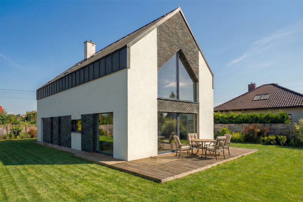 Zaprojektowany w technologii tradycyjnej z dachem skośnym o symetrycznym nachyleniu połaci.