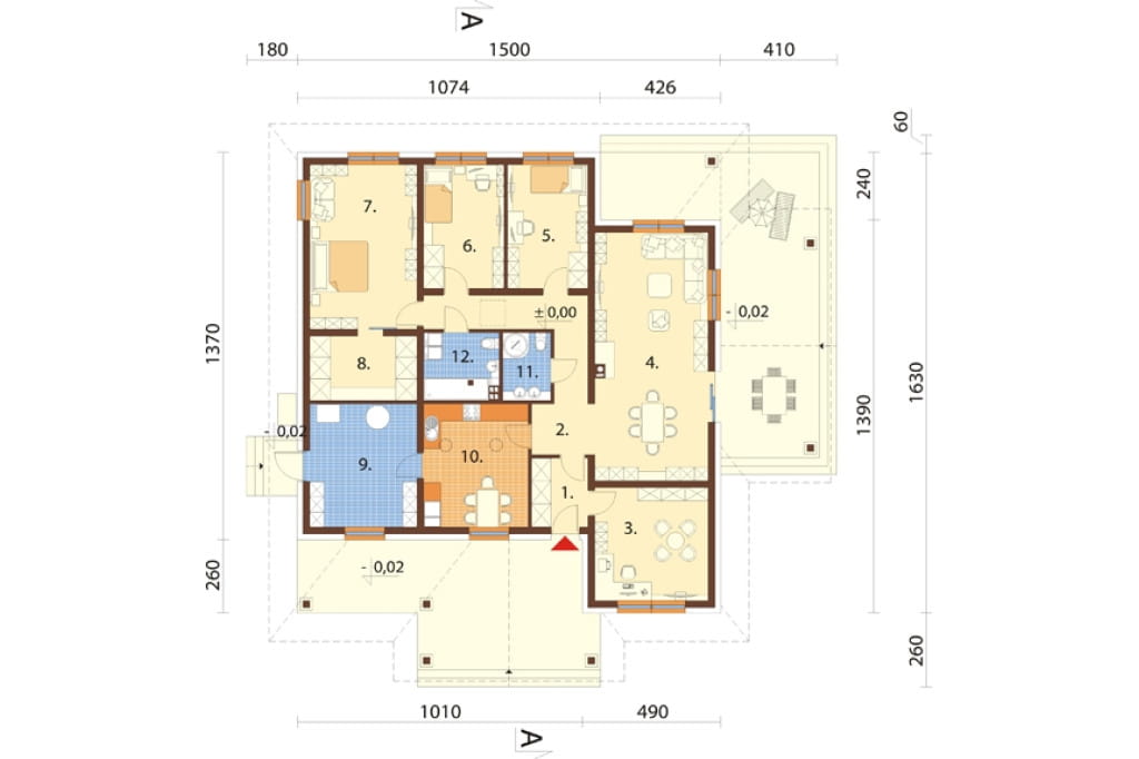 Powierzchnia użytkowa: 164.87 m2. Budynek jednorodzinny parterowy, niepodpiwniczony, bez garażu. Zaprojektowany w technologii murowanej z dachem wielospadowym. Dom przeznaczony dla 3-5 osób.