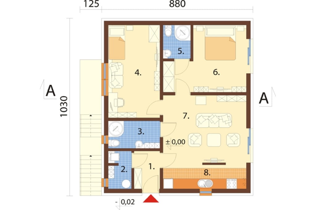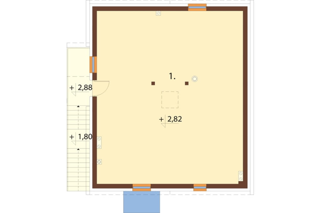 Program: wiatrołap, salon, 2 pokoje, kuchnia, 2 łazienki, pomieszczenie gospodarcze.