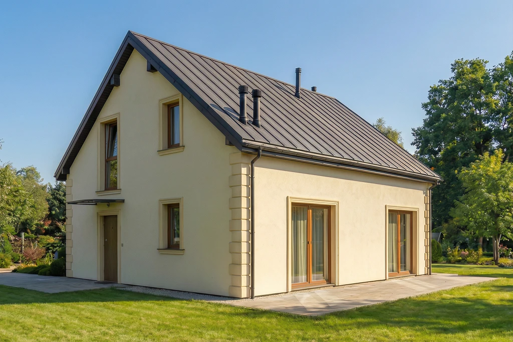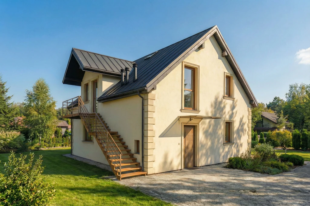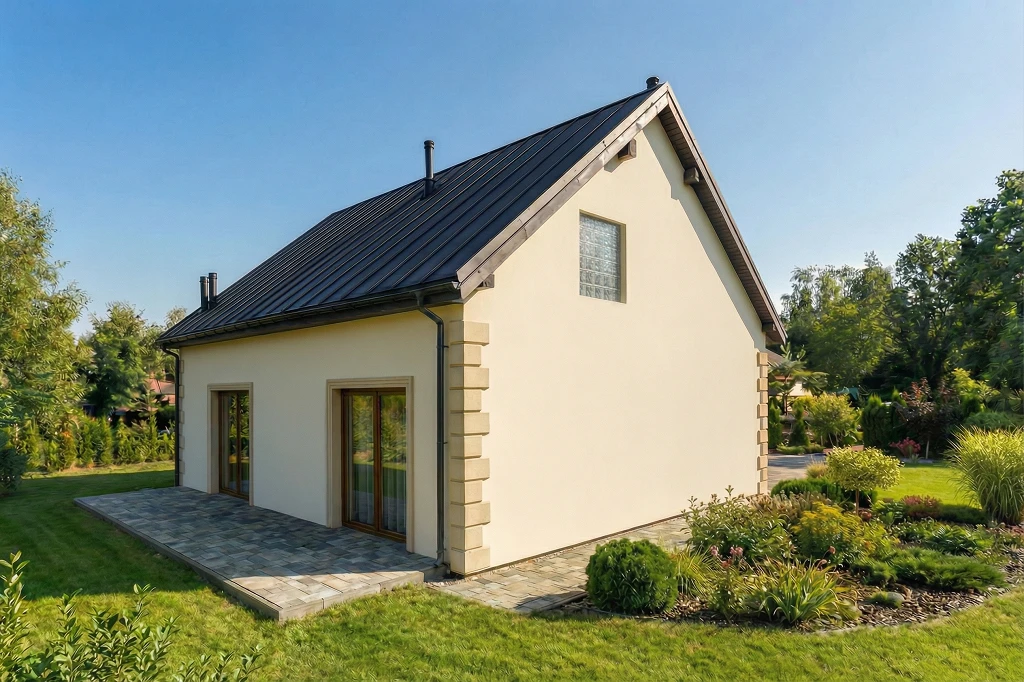 Ściany zewnętrzne: bloczki z betonu komórkowego 24 cm, styropian 15 cm, tynk cienkowarstwowy