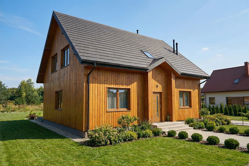 Ściany zewnętrzne: płyta GK-F 1,25 cm, łaty 5x5 cm, wełna szklana 5 cm, paroizolacja – folia PE, płyta OSB-3 1,5 cm, słupki drewniane 5x15 cm / wełna szklana 15 cm, płyta drewnopochodna paroprzepuszczalna 1,5 cm, wiatroizolacja – folia przepuszczalna, listwa dystansowa, gont elewacyjny