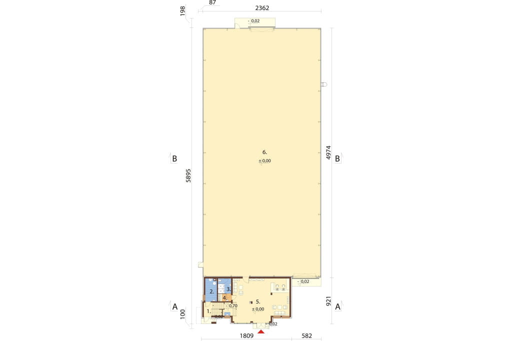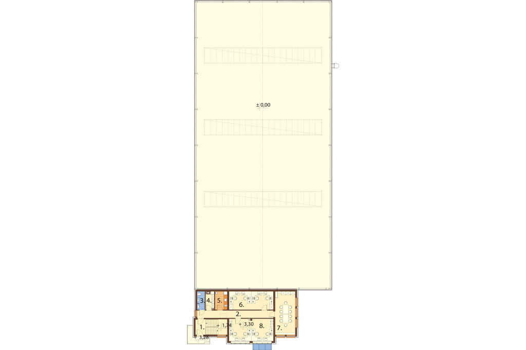 Parter: klatka schodowa, kotłownia, szatnia, WC + natryski, sala ekspozycyjna, hala magazynowo‑produkcyjna.