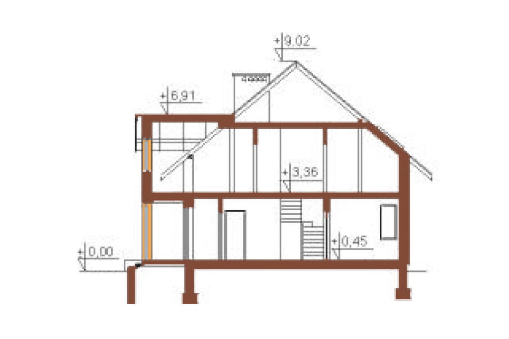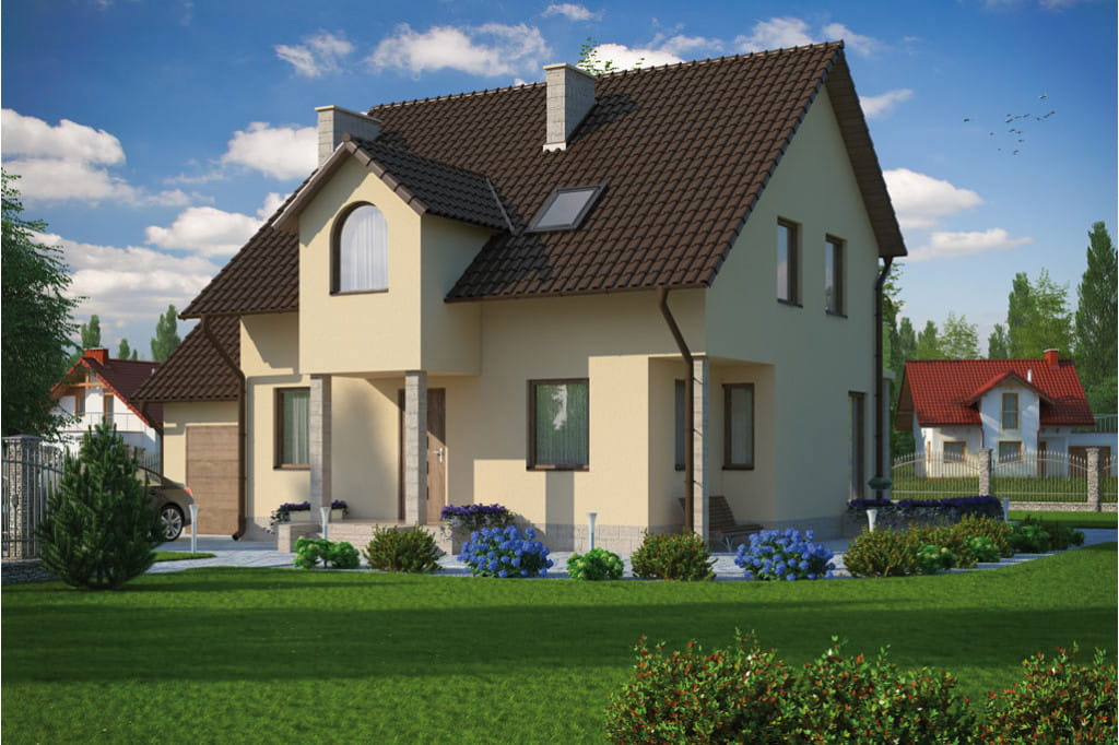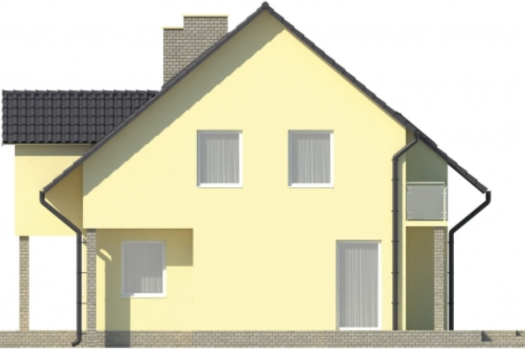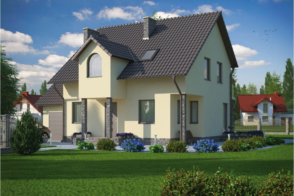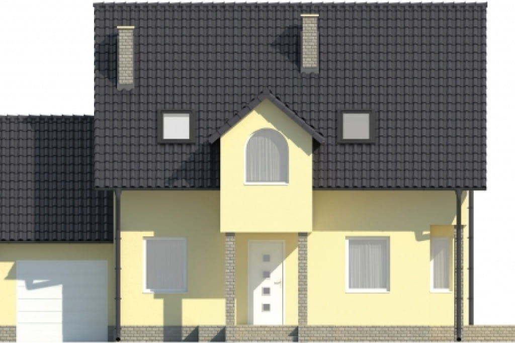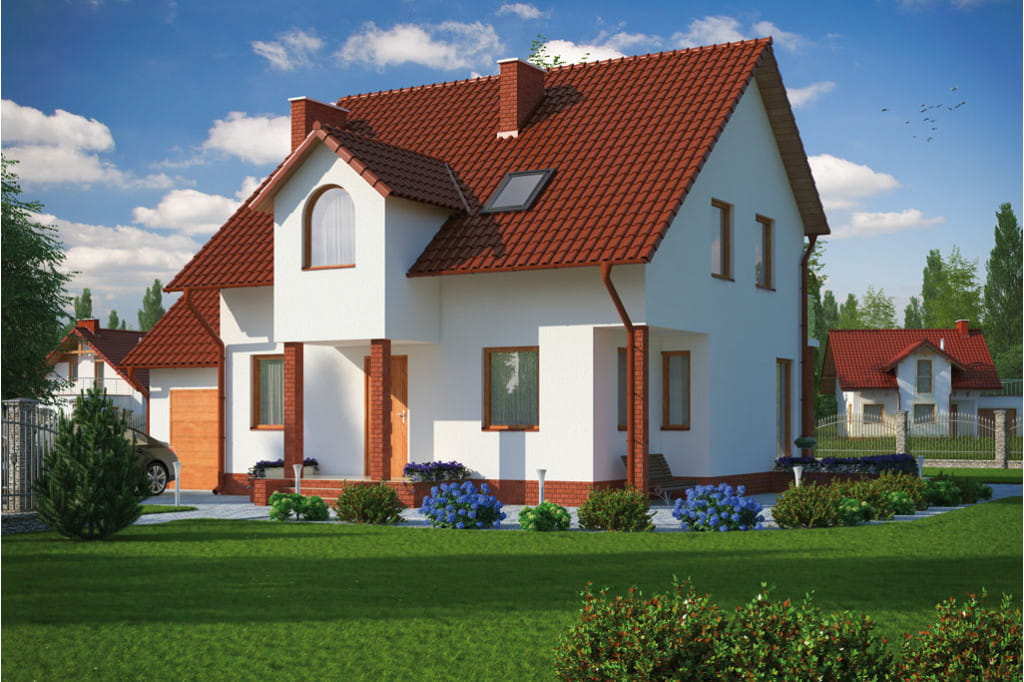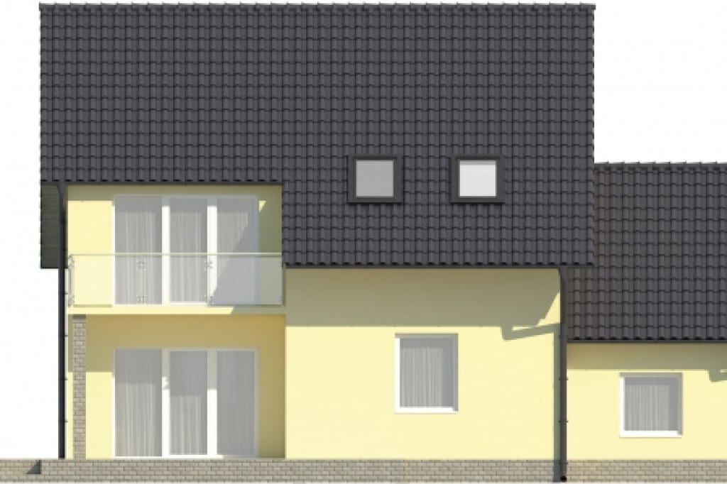 Budynek posiada zgrabną bryłę, której uroku dodaje lekko zaburzona symetria - z lewej strony dodany został garaż. Z prawej równoważy go podcień, a od strony ogrodu taras i balkon. Całość komponuje się harmonijnie, a przede wszystkim pozwala na funkcjonalną organizację wnętrza.