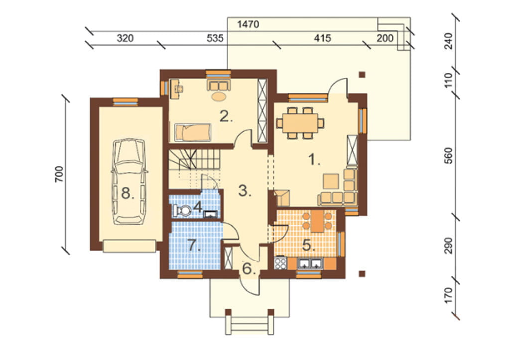 Podczas organizacji przestrzeni parteru, twórcy projektu mieli na uwadze przede wszystkim wygodę przyszłych domowników. Dlatego oprócz tradycyjnej strefy dziennej znalazł się tu również dodatkowy pokój. Ułożenie od strony ogrodu i odpowiednia konstrukcja ścian zapewniają w nim ciszę i spokój, stwarzając idealne warunki do pracy lub odpoczynku. Na prawo od wygodnego wiatrołapu umieszczono sporą kotłownię, a za nią WC. Na lewo znajduje się narożna, dobrze oświetlona kuchnia oraz salon. Jak przystało na centrum rodzinnych spotkań jest on przestronny, wyposażony w nastrojowy kominek oraz wyjście na taras. Z prawej strony do parteru przylega garaż.