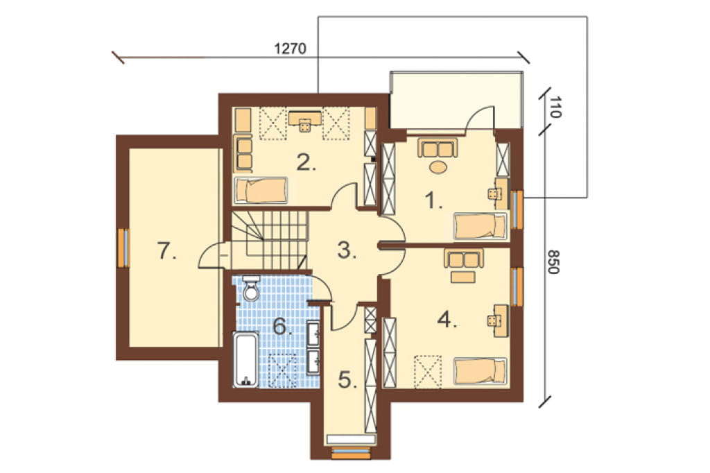 Poddasze to przede wszystkim strefa odpoczynku nocnego. Znajdują się tu trzy przestronne sypialnie, ogólnodostępna garderoba i ustawna łazienka. Nad garażem umieszczono funkcjonalny stryszek, który pomieści wszystkie nieużywane na co dzień sprzęty domowe, narty i rolki, a w razie potrzeby będzie go można zaadaptować na dodatkowy pokoik.