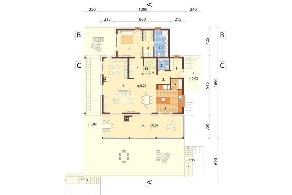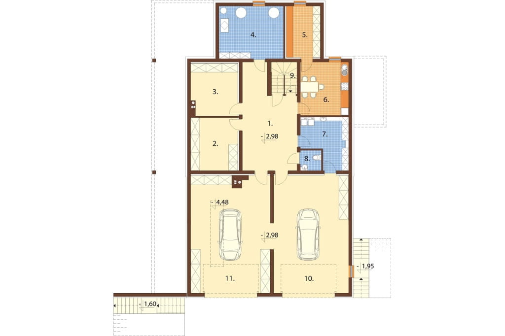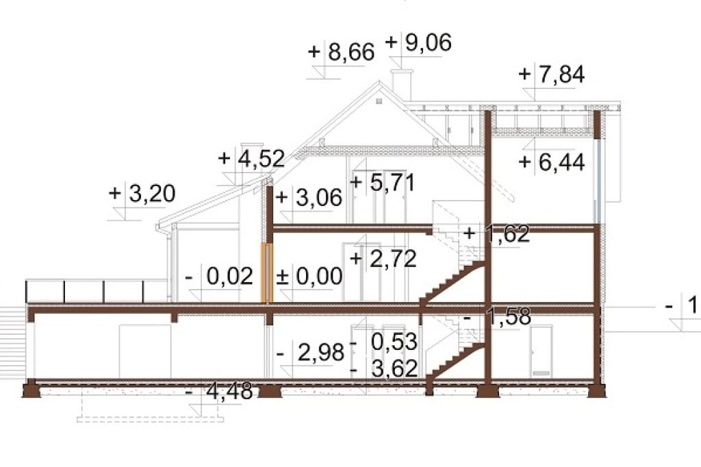 Program: 2 pomieszczenia garażowe, 2 pomieszczenia gospodarcze, pomieszczenie techniczne, pralnia, 2 wc, kuchnia, spiżarnia, schowek, korytarz, wiatrołap, hol, salon z jadalnią, kuchnia, spiżarnia, 4 pokoje, garderoba, 2 łazienki, schody, hol, garderoba, pokój gier,