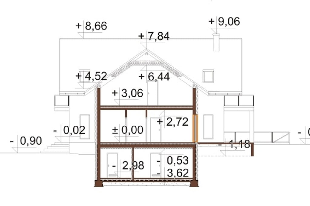 Budynek parterowy z poddaszem użytkowym, podpiwniczony, z garażem dwustanowiskowym.