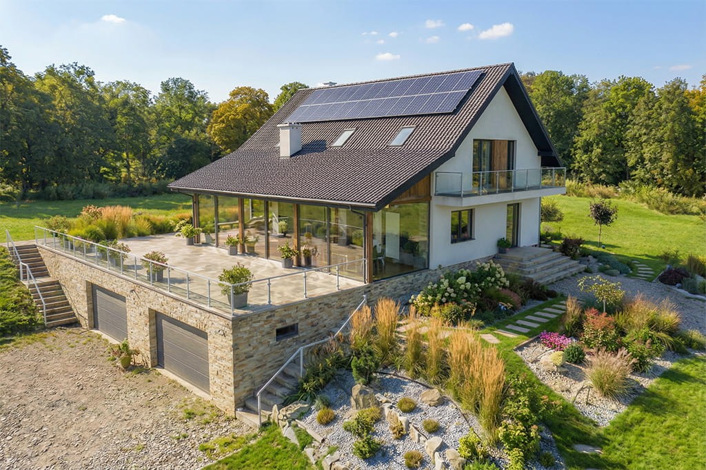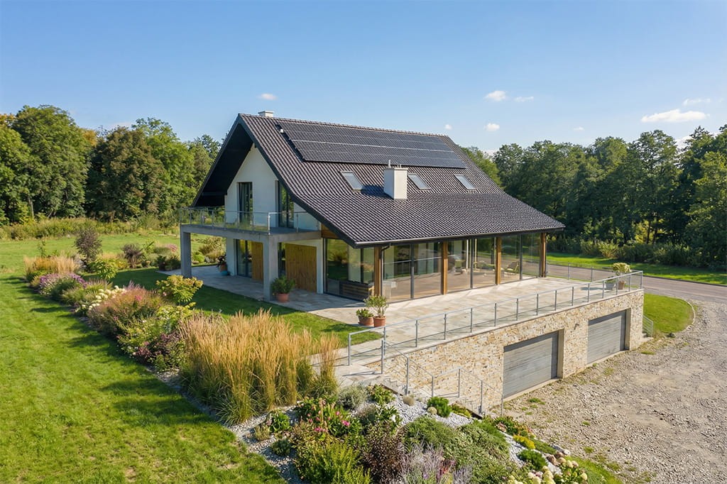 W budynku zaprojektowano również instalację fotowoltaiczną na dachu o mocy 9,12 kWp, która produkuje prąd na potrzeby pompy ciepła do podgrzewu co i ciepłej wody użytkowej oraz wentylacji mechanicznej.