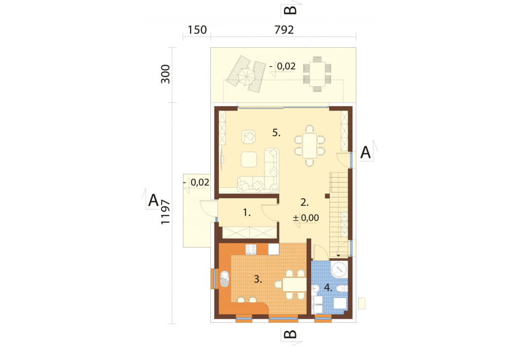 Program: wiatrołap, komunikacja, kuchnia z jadalnią, salon, 2 łazienki, 3 pokoje, hol.