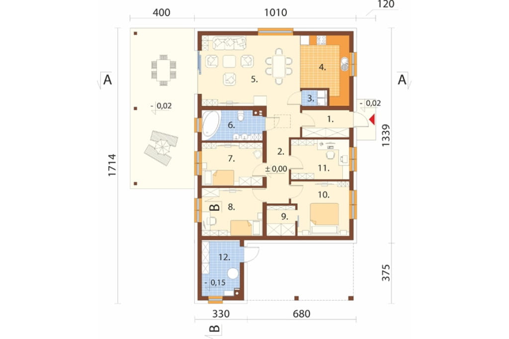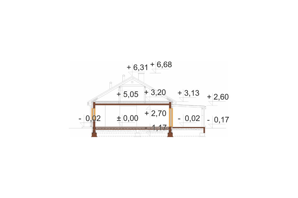 Powierzchnia użytkowa: 113,25 m2. Budynek jednorodzinny parterowy, niepodpiwniczony, bez garażu. Zaprojektowany w technologii murowanej z dachem dwuspadowym. Dom przeznaczony dla 2-6 osób.