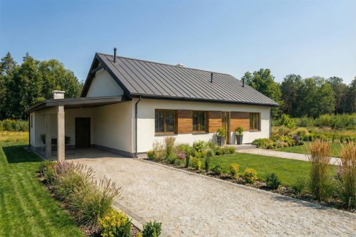 Program: wiatrołap, hol, salon, kuchnia, pralnia, garderoba, łazienka, gabinet, 3 sypialnie, kotłownia oraz wiata garażowa.
