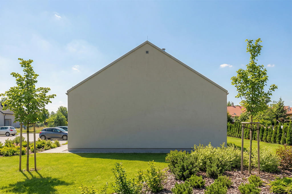 Ściany zewnętrzne: beton komórkowy 24 cm, styropian 15 cm, tynk zewnętrzny