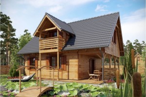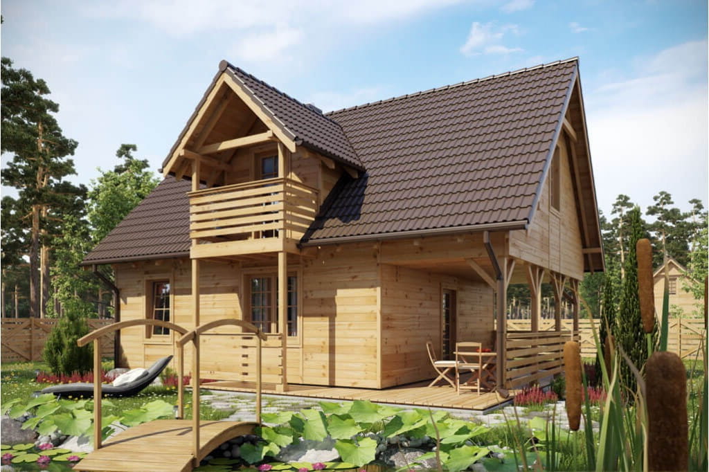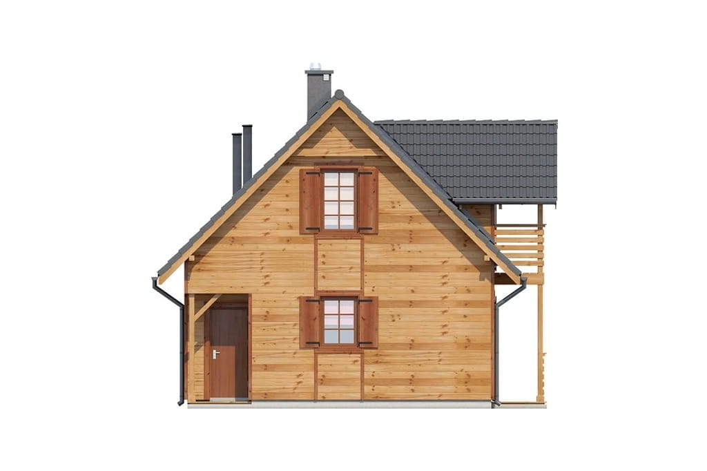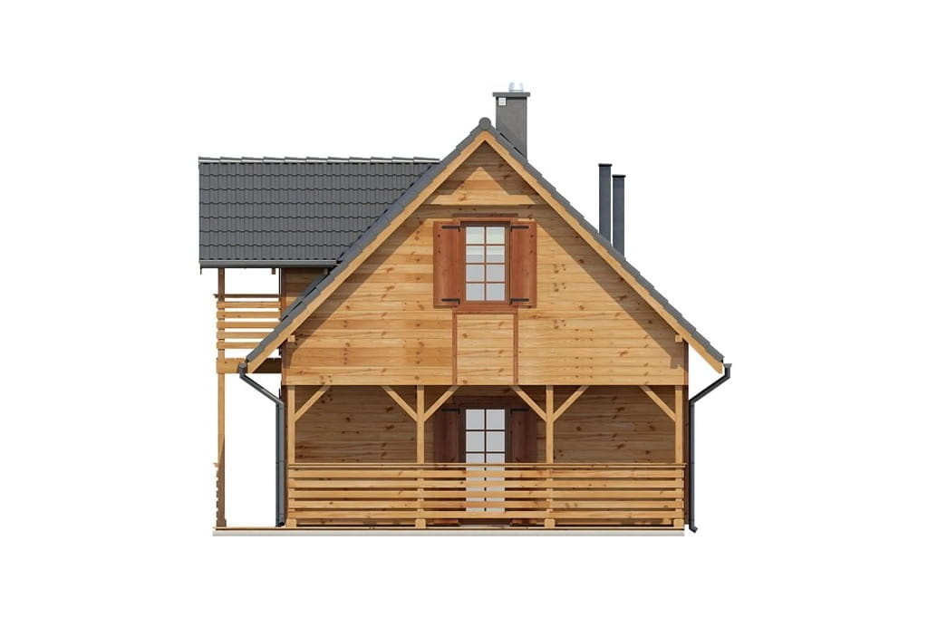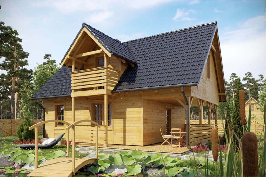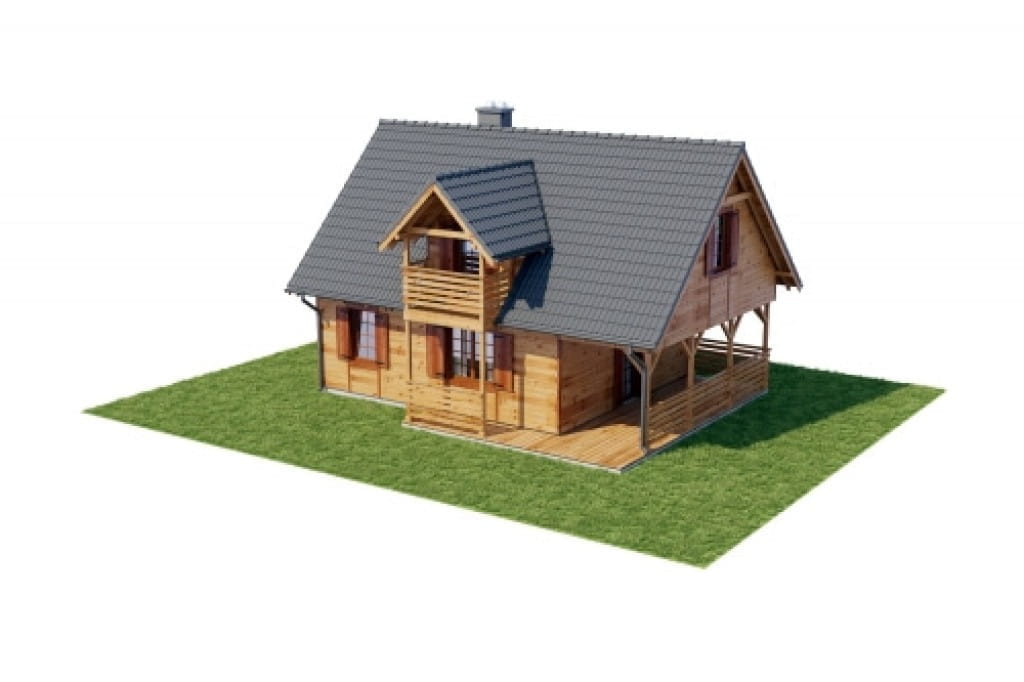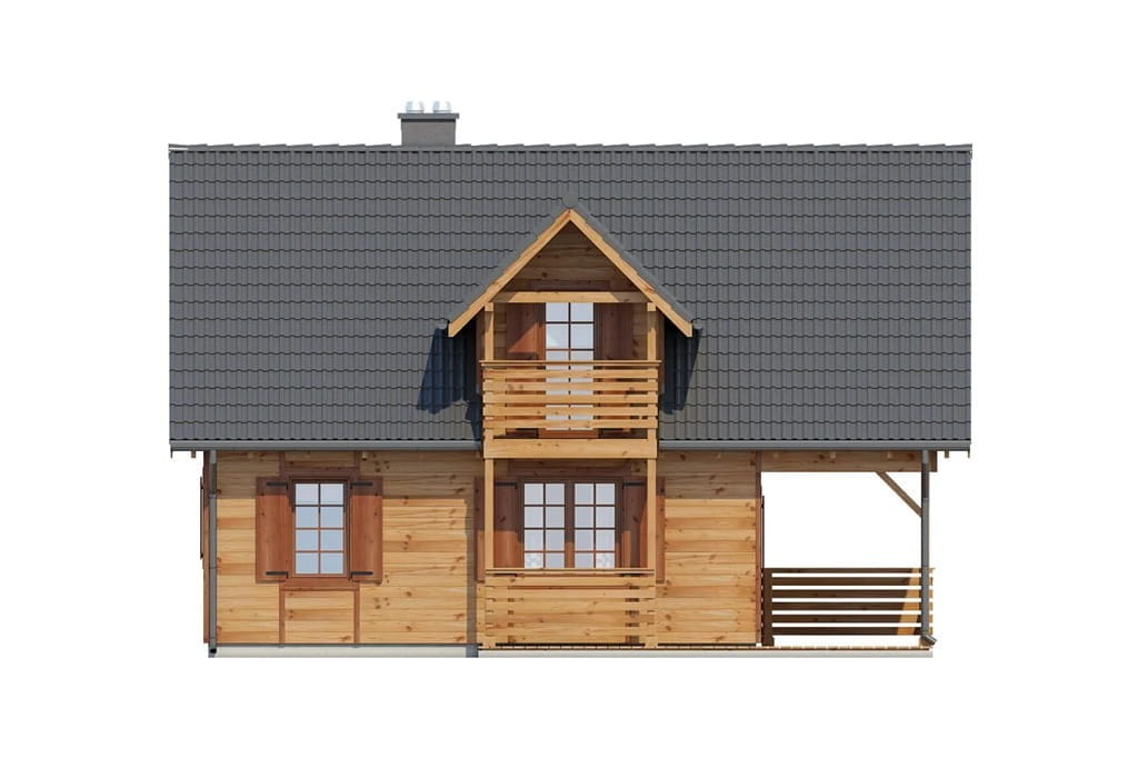 Uroczy budynek o filigranowych rozmiarach to propozycja dla osób, które szukają funkcjonalnego budynku w technologii drewnianej. Dzięki obecności balkonu i tarasu umieszczonego w podcieniu obiekt doskonale nadaje się na działkę rekreacyjną, jednak bogaty program zapewnia komfortowe warunki dla średniej wielkości rodziny.