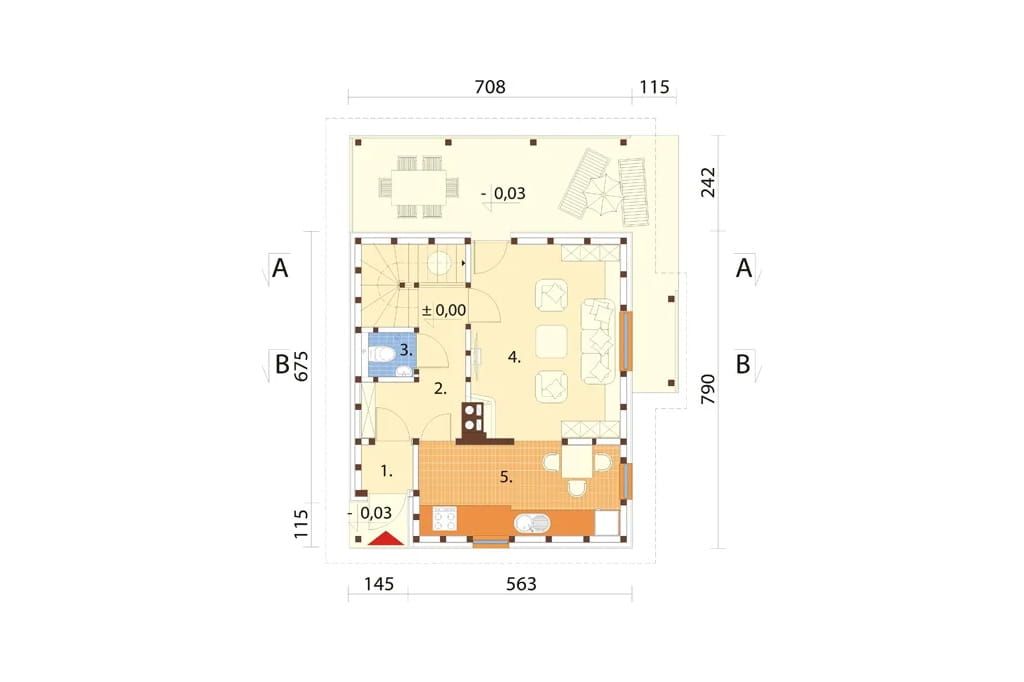Niewielki wiatrołap uniemożliwi wtargnięcie do budynku wraz z wchodzącymi chłodnego powietrza z zewnątrz. Znajdująca się za nim komunikacja zapewnia wygodne poruszanie się miedzy pozostałymi pomieszczeniami domu - kuchnią, WC oraz pokojem dziennym z wyjściem na taras. W rogu komunikacji znajdują się schody prowadzące na poddasze.