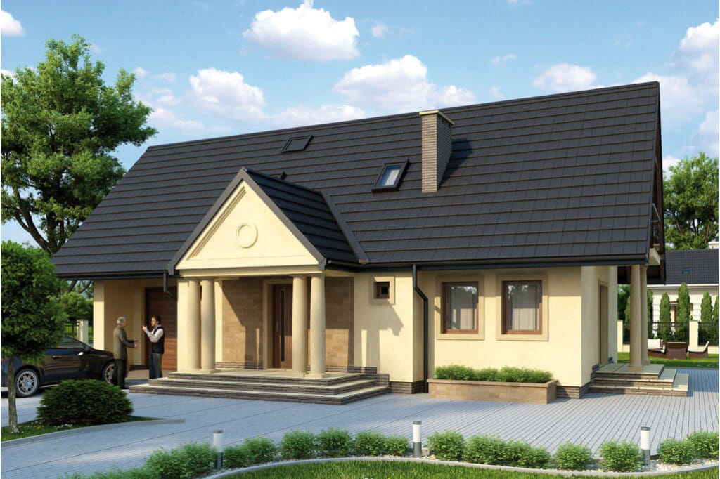 Projekt domu HELENÓWKA, L-6216. Budynek jednorodzinny, parterowy z poddaszem użytkowym. Mimo niewielkich rozmiarów cechuje go duża funkcjonalność i praktyczne rozplanowanie wewnętrznej przestrzeni. Projekt z pewnością zaspokoi potrzeby średniej wielkości rodziny.