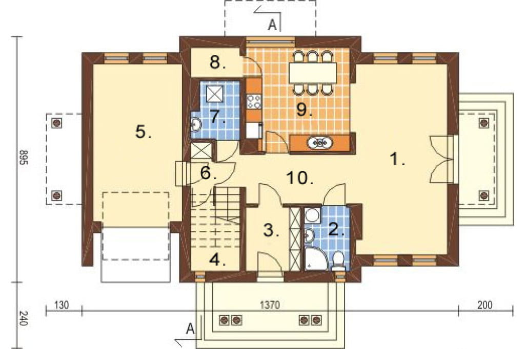 Główne wejście do domu prowadzi przez wiatrołap. Na prawo znajduje się łazienka oraz przestronny pokój dzienny z wyjściem na taras i delikatnym połączeniem z kuchnią. Miłośnikom gotowania z pewnością spodoba się obecność przykuchennej spiżarni. Z lewej strony, między schodami na poddasze, a kotłownią znajduje się niewielka garderoba z przejściem do garażu.