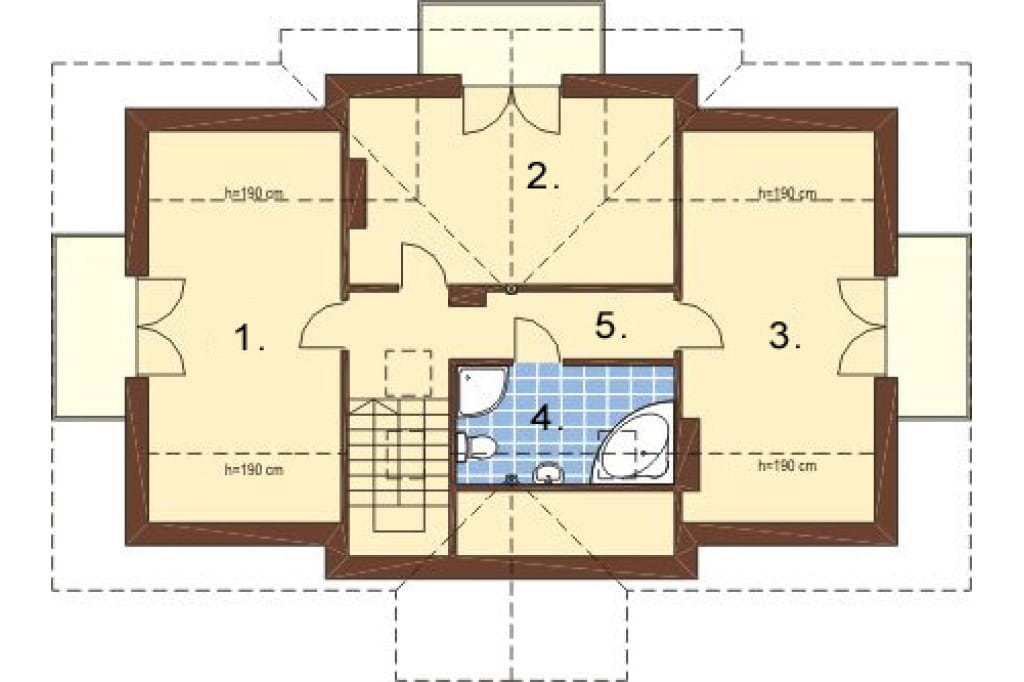 Program poddasza stanowi druga łazienka i trzy niezwykle komfortowe pokoje. Każdy z nich wyposażony został w prywatny balkon. Rozwiązanie to otwiera wnętrze domu na otaczający krajobraz i ułatwia domownikom kontakt z naturą, a także zwiększa efektywność odpoczynku.
