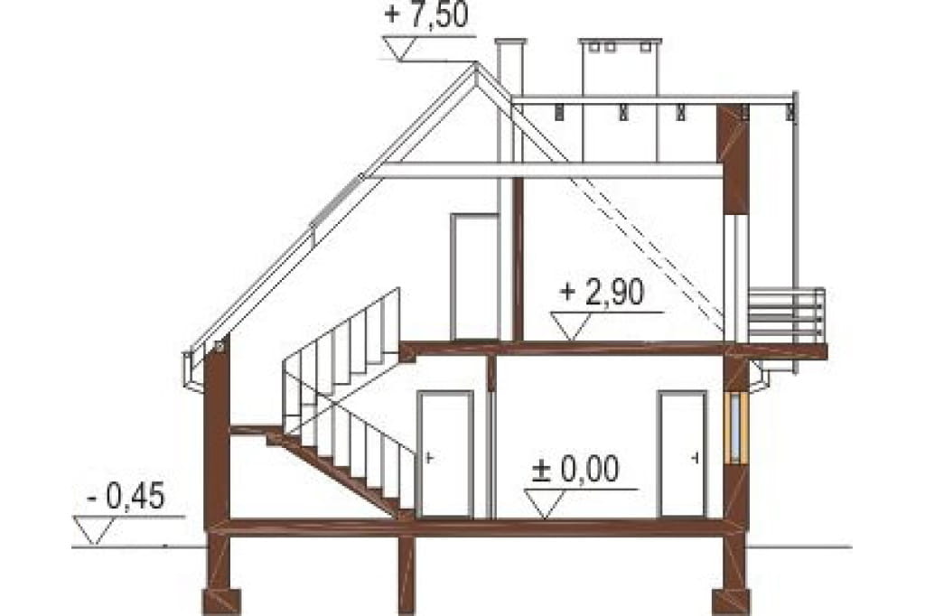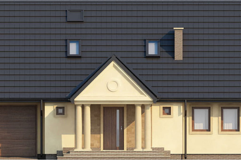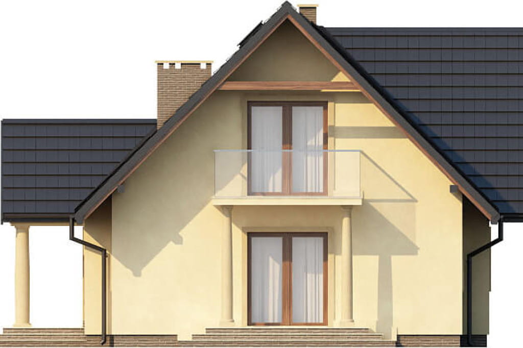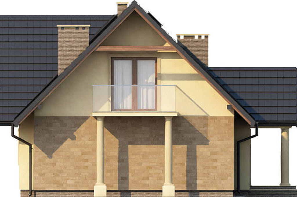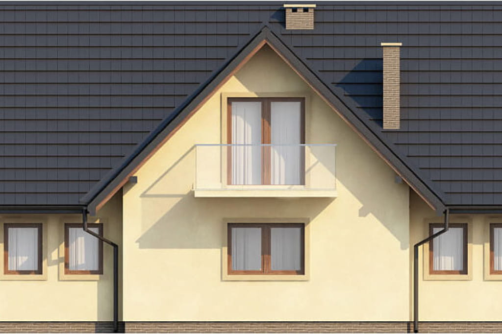 Projekt cechuje się stosunkowo zwartą bryłą z niewielkimi wysunięciami w środkowej części elewacji frontowej i ogrodowej. Konstrukcja dachu jest prosta, dwuspadowa z niewielkimi załamaniami nad balkonem na tyłach domu i głównym wejściem. Delikatne przedłużenie połaci zapewnia zadaszenie balkonów umieszczonych na bocznych elewacjach bryły.