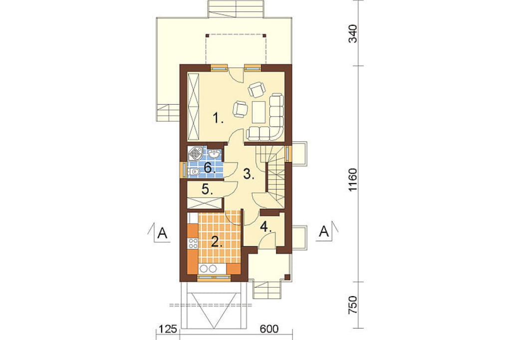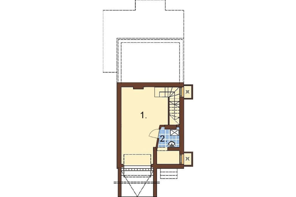 Główne wejście do domu umieszczono w podcieniu. Przechodząc przez wiatrołap można dostać się do komunikacji i pozostałych pomieszczeń parteru: pokoju dziennego z wyjściem na taras, wygodnej łazienki, garderoby oraz narożnej kuchni.