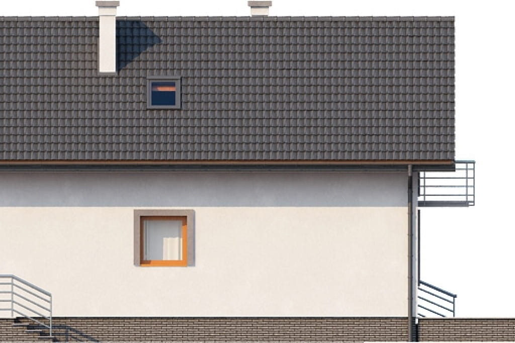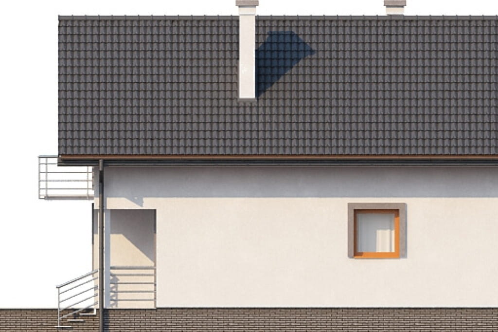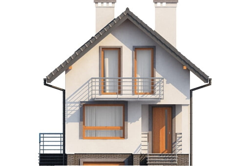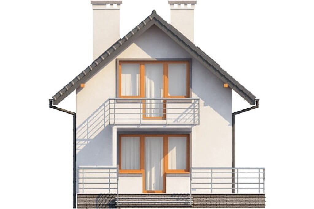 Bardzo przyjemny w odbiorze wizualnym projekt budynku przeznaczonego na wąską działkę. Przeszklenia i balkony zlokalizowane zostały na elewacji frontowej i ogrodowej, aby umożliwić swobodną lokalizację domu na działce o nietypowym kształcie. Tradycyjny charakter budynku podkreślony jest przez obecność czerwonego dachu i drewnianej zabudowy balkonów, jednak ostateczny wygląd elewacji uzależniony jest od upodobań Inwestora.
