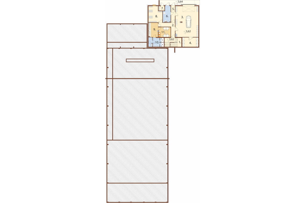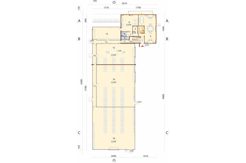 Parter: klatka schodowa, korytarz, biuro, pokój śniadań, szatnia personelu biurowego, biuro obsługi klienta, przedsionek, WC damskie / dla niepełnosprawnych, WC męskie oraz 4 pomieszczenia magazynowe.