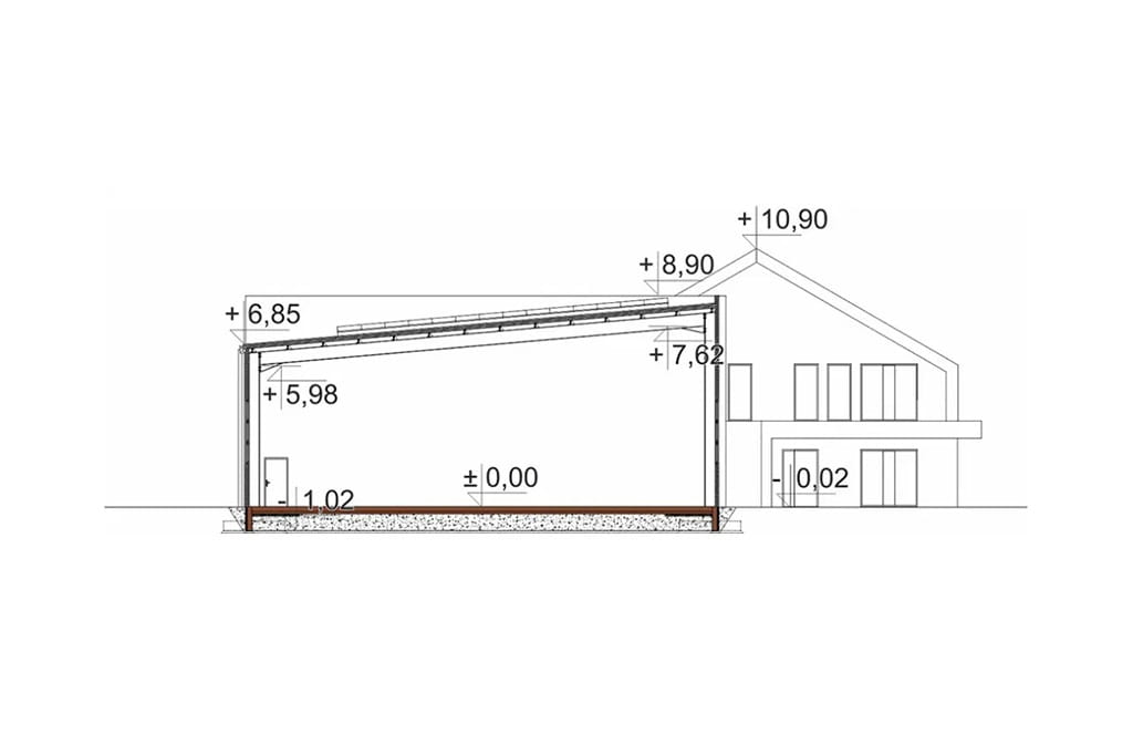 Powierzchnia użytkowa: 1465,99 m2. Projekt budynku usługowego z częścią magazynową. Część biurowa / usługowa - podpiwniczona, posiada 2 kondygnacje nadziemne: parter oraz poddasze użytkowe, przykryta dachem skośnym o symetrycznym nachyleniu połaci wynoszącym 30°. Część magazynowa - niepodpiwniczona, posiada 1 kondygnację nadziemną, przykryta dachem jednospadowym o nachyleniu połaci dachowej 5°. W budynku przewiduje się około 25-30 pracowników.