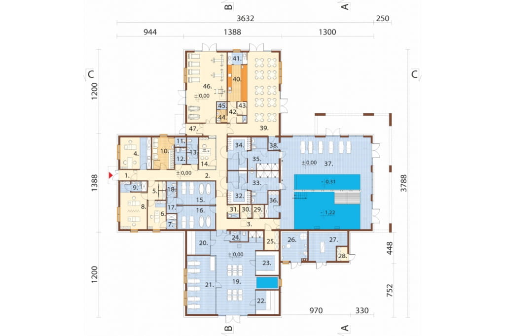 wiatrołap, korytarz, gabinet kosmetyczny, przedsionek + 2 x gabinet masażu z łazienką, szatnia personelu + WC, WC ogólnodostępne męskie, WC ogólnodostępne damskie / dla osób niepełnosprawnych, recepcja, 2 x sauna piwna + WC, pomieszczenie wypoczynkowe + sauna ziołowa, fińska, parowa + pomieszczenie relaksacyjne + WC, 4 x pomieszczenia techniczne, pomieszczenie porządkowe, 2 x pomieszczenia gospodarcze, szatnia / przebieralnia męska + WC / natryski, szatnia / przebieralnia damska + WC / natryski, składzik sprzętu basenowego, basen, przedsionek, sala barowa, bar, zmywalnia, korytarz, punkt przyjęcia cateringu, szatnia personelu baru + WC oraz siłownia.