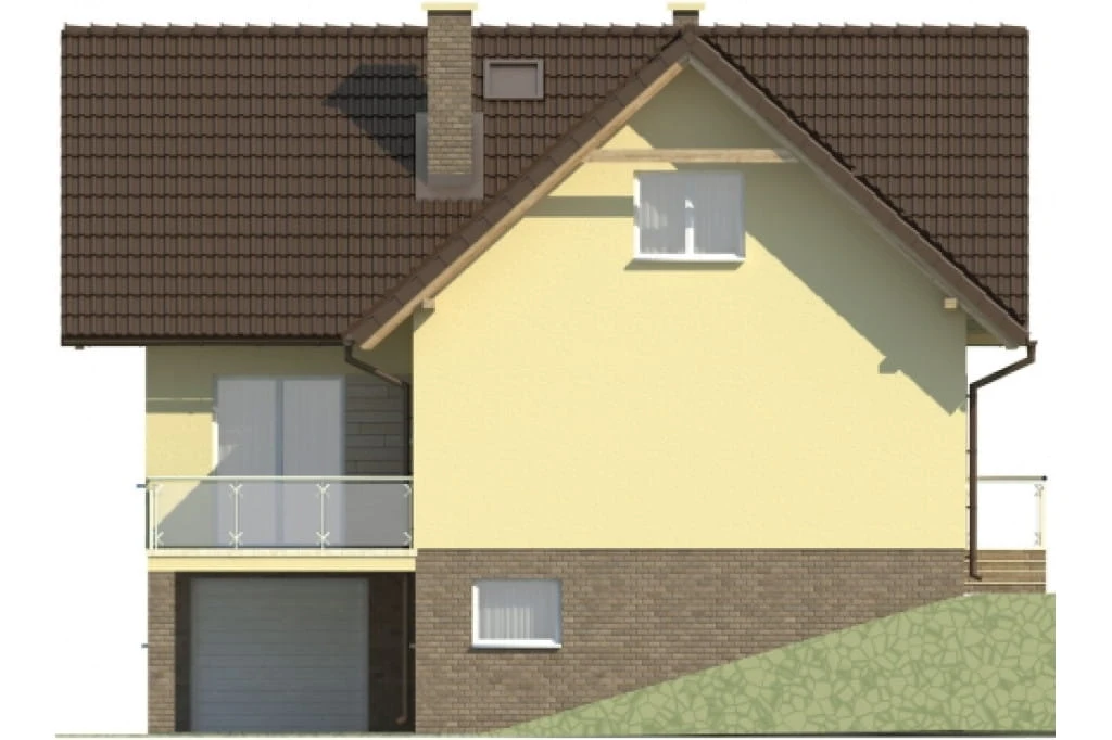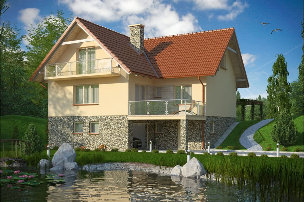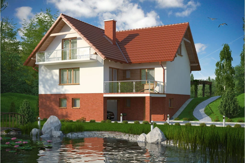Budynek zaprojektowano z myślą o terenach ze spadkiem. Wykorzystanie naturalnego nachylenia działki zapewnia swobodny dostęp do pomieszczeń piwnicy oraz wjazd do garażu. Zaplanowanie budynku w kształcie litery L zwiększa funkcjonalność pomieszczeń i sprawia, że osłonięty z dwóch stron taras zapewnia domownikom większą prywatność.