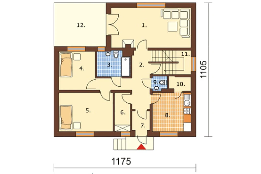 Tradycyjne rozplanowanie przestrzeni parteru zapewnia mieszkańcom wygodę i jest niezwykle funkcjonalne. Główne wejście prowadzi do wiatrołapu, skąd przejść można do korytarza. Na lewo umieszczono garderobą - ze względu na sąsiedztwo z wiatrołapem idealne miejsce do przechowywania odzieży wierzchniej. Na prawo znajduje się wygodna kuchnia z przylegającą spiżarnią. Za kuchnią zaplanowano WC, klatkę schodową oraz przestronny pokój dzienny z kominkiem i wyjściem na taras. W części parteru położonej z lewej strony znajduje się strefa sypialna - dwa pokoje i łazienka. W razie potrzeby, pokoje te mogą pełnić funkcję gościnnych, gabinetu, biblioteki czy sypialni dla seniorów.