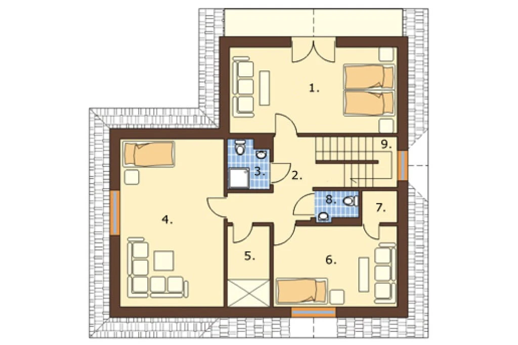 Na poddaszu zaplanowano trzy przestronne, wygodne pokoje, jeden z nich wyposażony jest w prywatny schowek. Na korytarzu znajduje się łazienka, WC oraz ogólnodostępna garderoba.