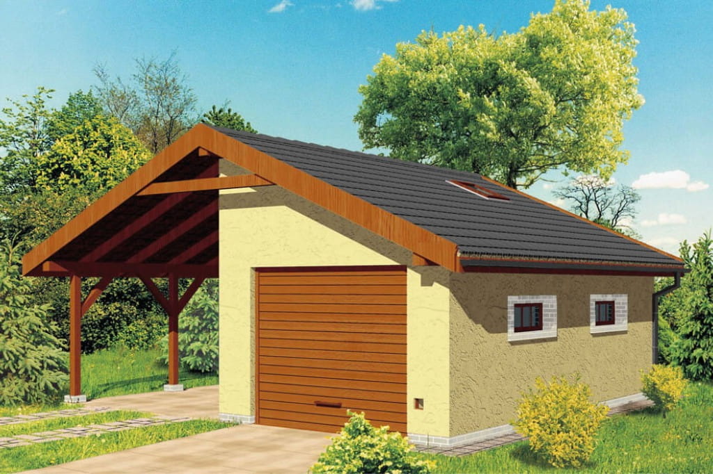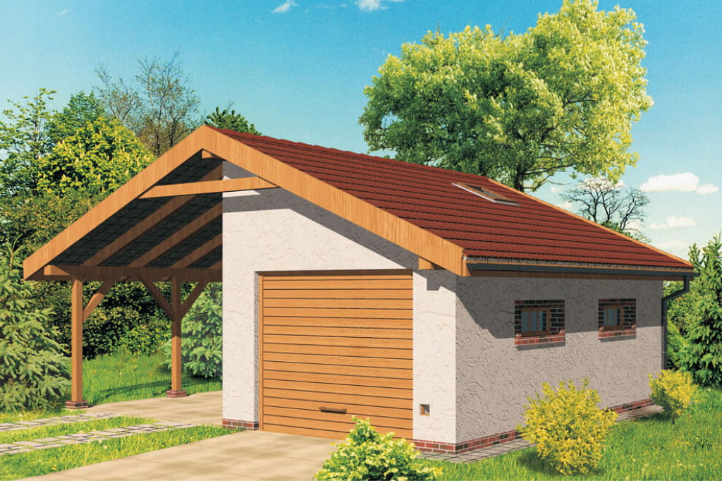 Zamknięta część budynku chroni samochód przed niesprzyjającymi warunkami atmosferycznymi, część zadaszona stanowi ochronę przed deszczem i nadmiernym słońcem. prosta konstrukcja z dwuspadowym dachem gwarantują szybką realizację bez nadmiernego obciążania budżetu inwestora.