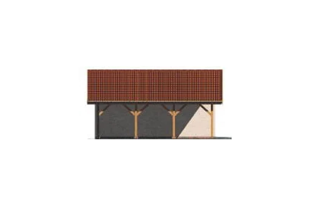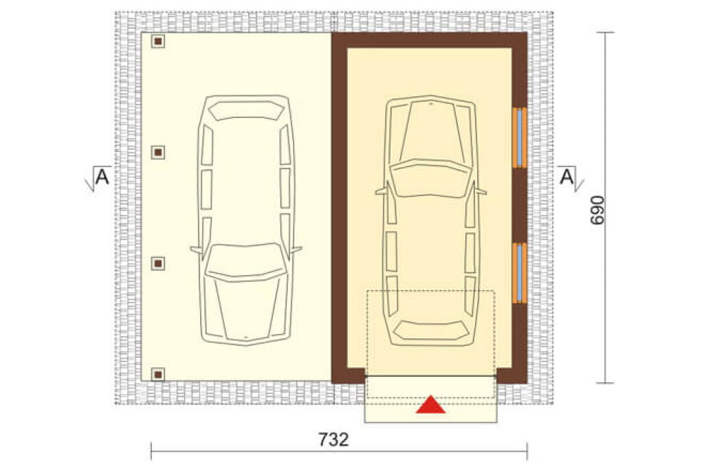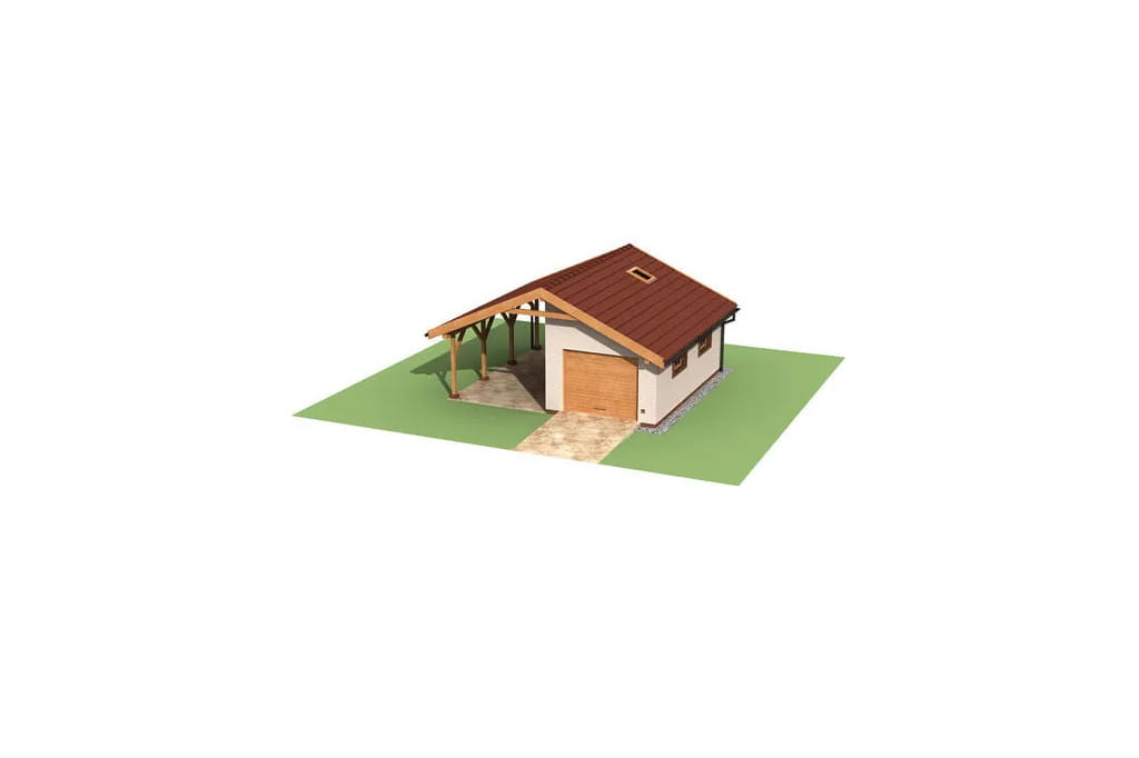 Obiekt mieści w sobie garaż jednostanowiskowy przeznaczony na średniej wielkości samochód osobowy oraz wiatę, pod którą zmieści się drugi samochód. Prosta konstrukcja budynku jest gwarancją szybkiej i bezproblemowej budowy.