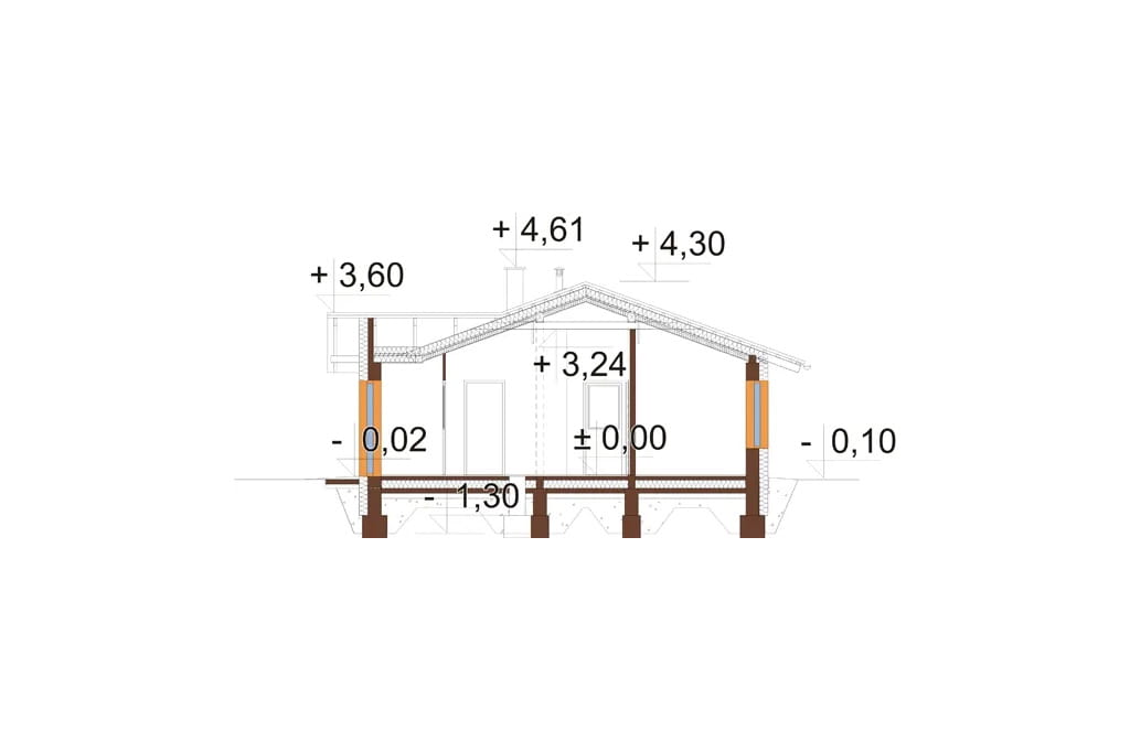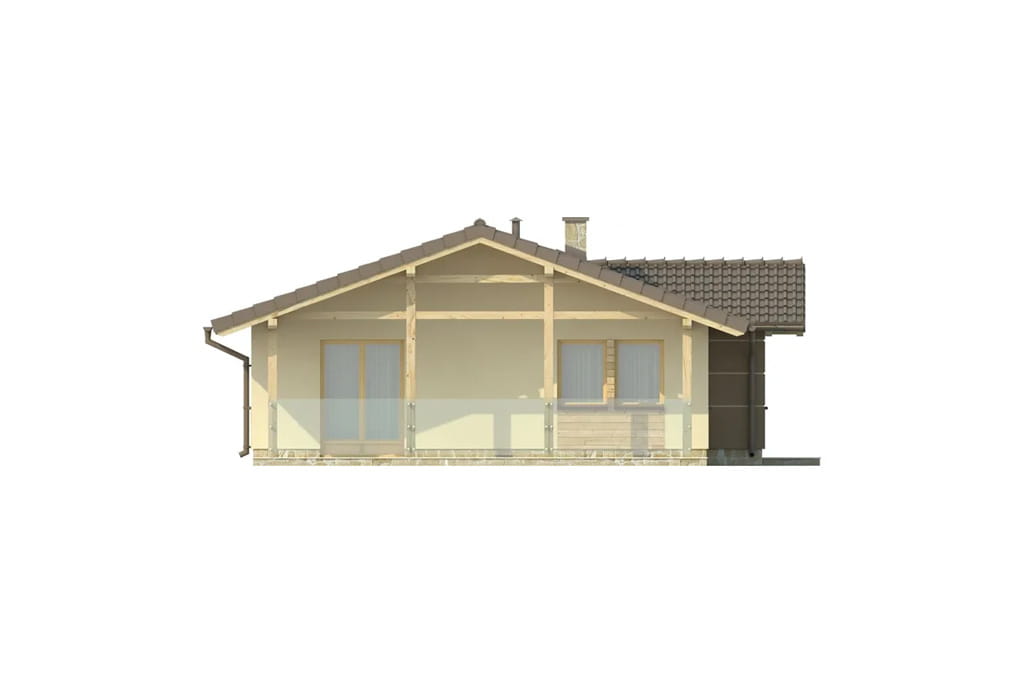 Projekt niewielkiego domu parterowego, w którym zaplanowano trzy sypialnie oraz bardzo przyjemny, zadaszony taras. Jego styl jest bardzo urokliwy, doskonale podkreślony przez dwuspadowy dach o niedużym kącie nachylenia połaci oraz drewniane podpory niosące zadaszenie tarasu. Ponadto, elewacje utrzymano w charakterze minimalistycznym, który można wzbogacić poprzez zróżnicowanie kolorów okładzin wykończeniowych. Dom stwarza więc, duże możliwości jeśli chodzi o dostosowanie go do indywidualnego gustu użytkowników. Dodatkowo, budynek jest dość niski, co korzystnie wpłynie na lepsze wpisanie go w otoczenie.