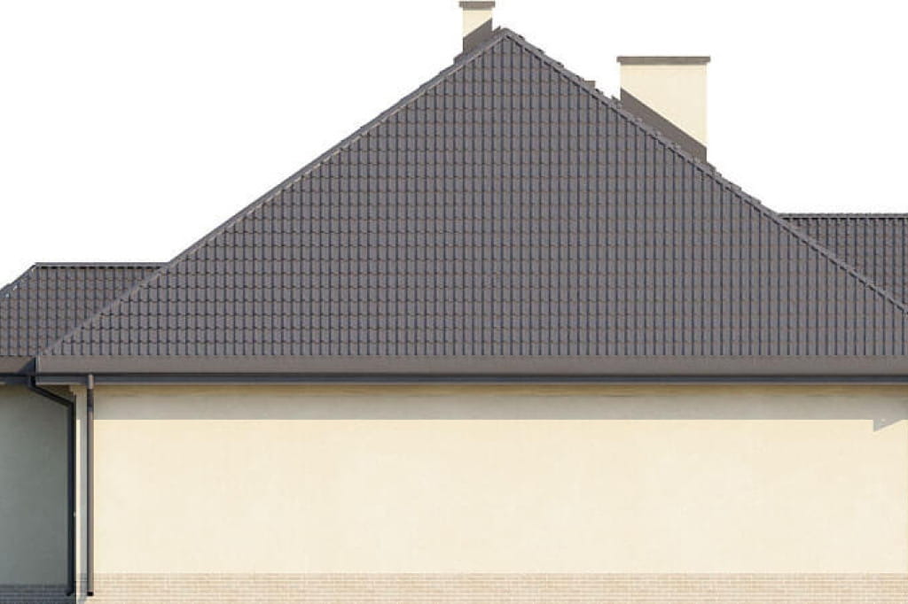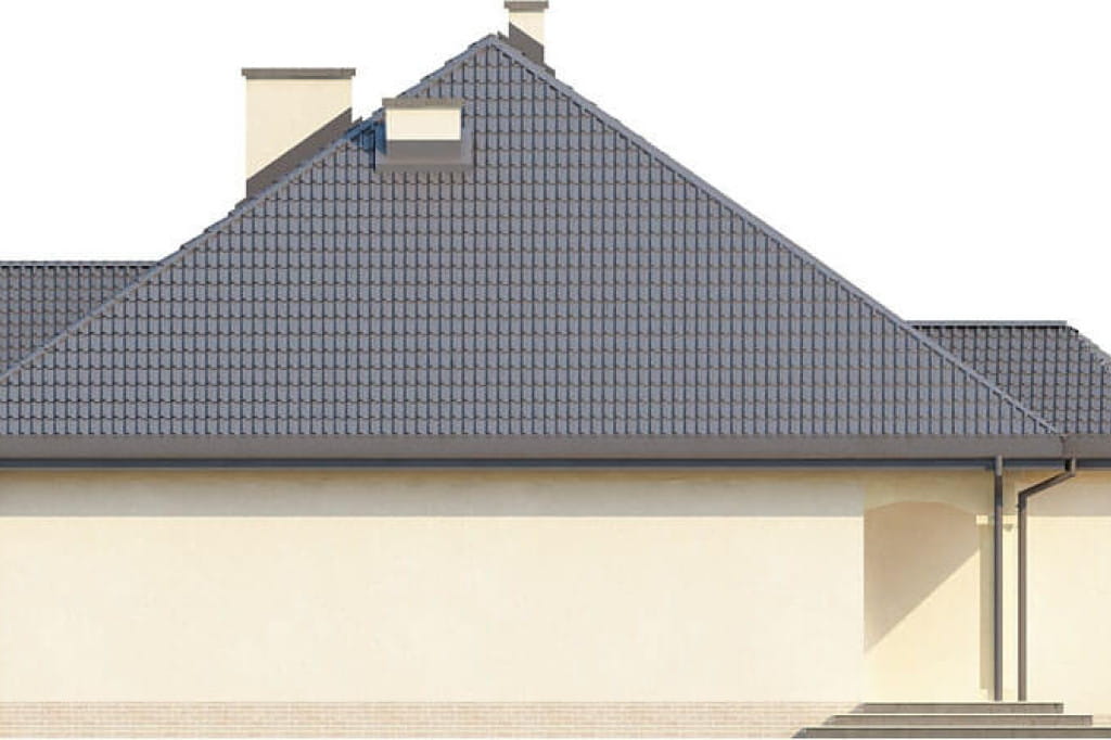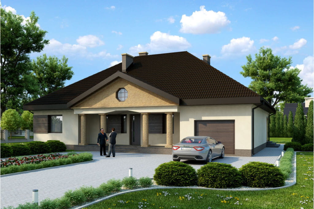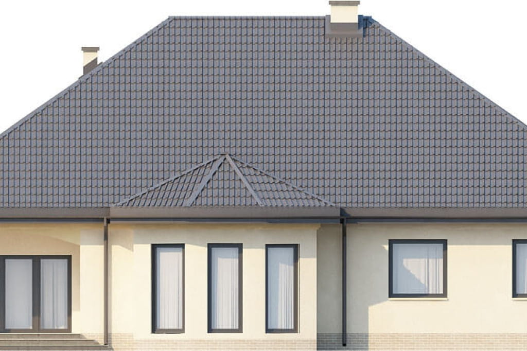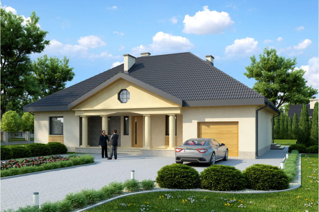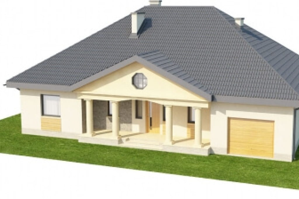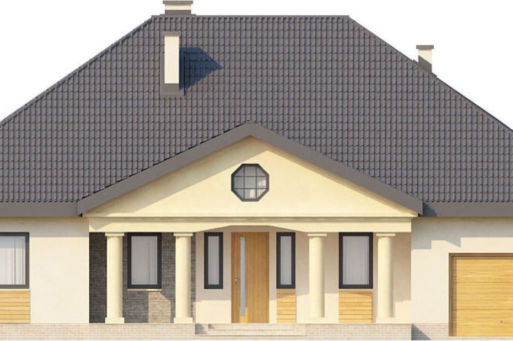Projekt parterowego domu stylizowanego na dwór szlachecki przypadnie do gustu osobom spokojnym, przywiązanym do tradycji. Urok budynku w pełni zaprezentuje się na obszernej, bogatej w zieleń działce, z ogrodem lub sadem. Szlachecką duszę projektu podkreślają drewniane okiennice, prosta elewacja, kopertowy dach i efektowny tympanon na elewacji frontowej. Wsparty na czterech kolumnach tworzy praktyczne zadaszenie nad głównym wejściem do domu.