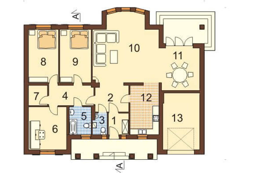 Atutem projektu jest przestronna strefa dzienna. Składa się na nią hall płynnie przechodzący w pokój dzienny oraz jadalnia z wyjściem na taras. Obok jadalni znajduje się wygodna kuchnia, a na prawo od kuchni garaż. Lewa część domu to strefa sypialna - trzy niezależne pokoje, łazienka oraz WC. Główne wejście do budynku prowadzi przez wiatrołap.