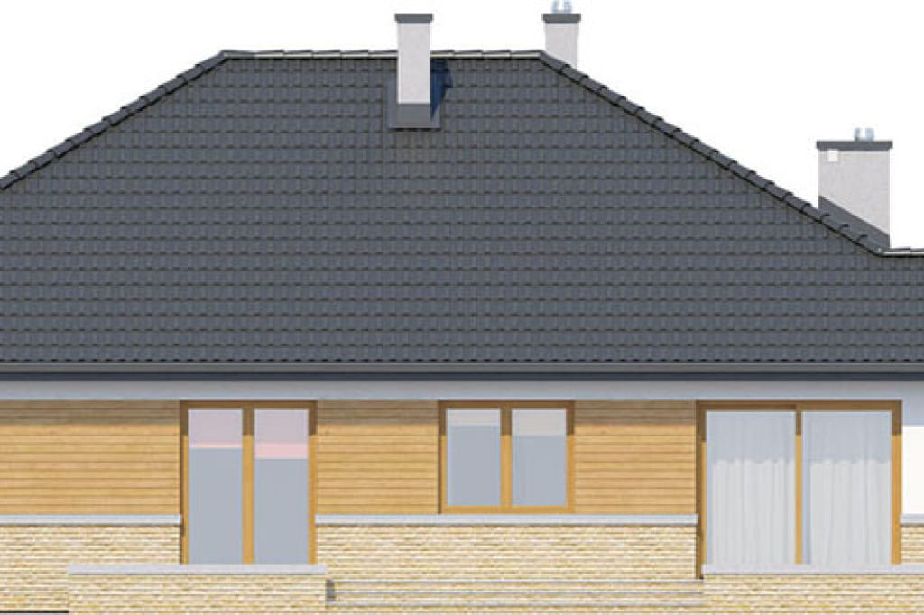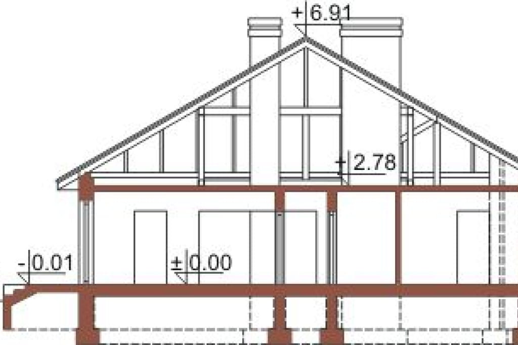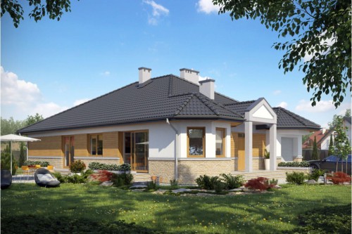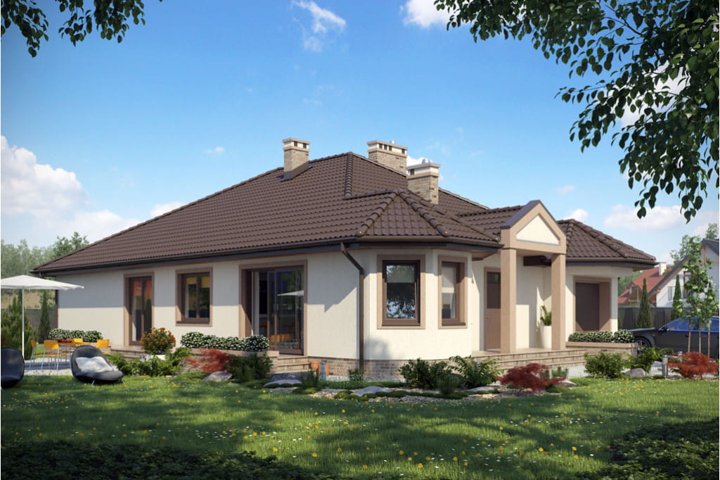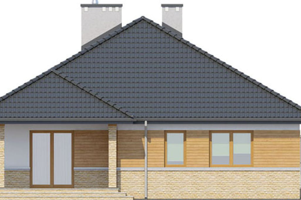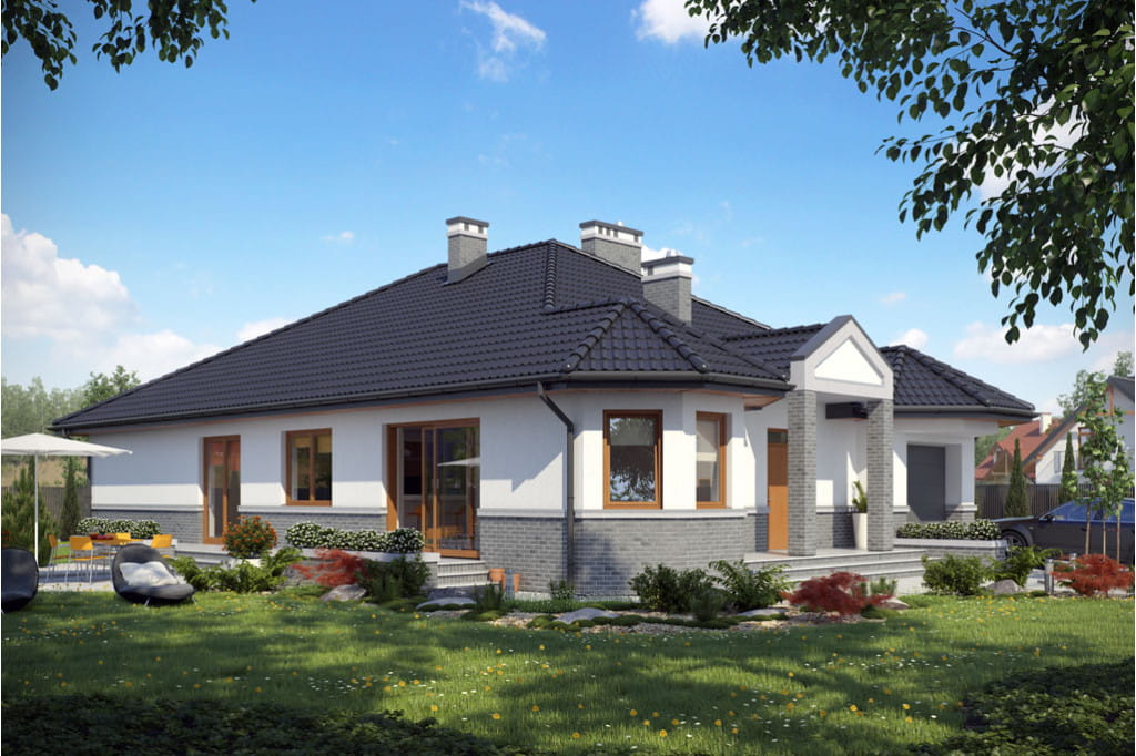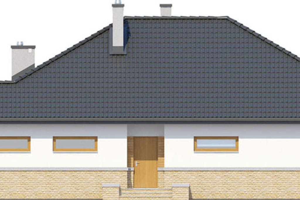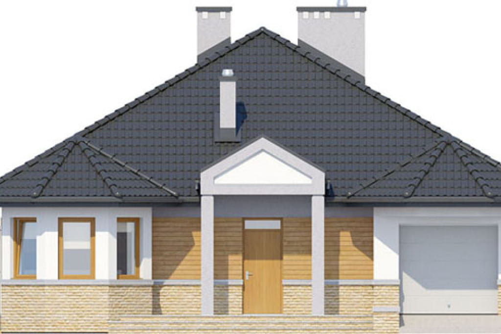 Stosunkowo prosta bryła pokryta kopertowym dachem jest łatwa i niedroga w realizacji. Zdobienia na elewacji frontowej znacznie zwiększają atrakcyjność odbioru wizualnego budynku.