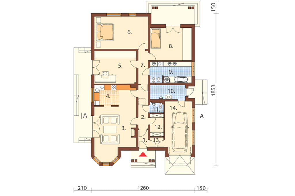 Program: 3 pokoje, salon, kuchnia, garderoba, łazienka, WC, kotłownia, garaż.