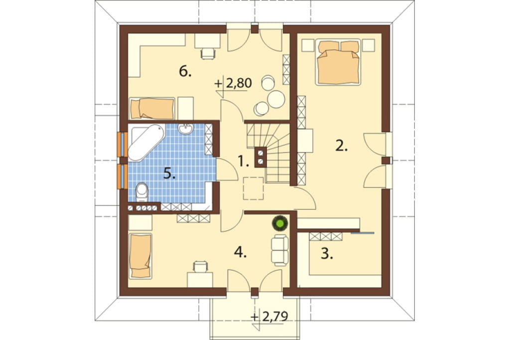 Na poddaszu nasi architekci przygotowali strefę sypialną z trzema pokojami oraz dużą wspólną dla domu łazienką. Pokój numer 2 jest doskonałym miejscem na sypialnię dla głowy rodziny. Zaprojektowaliśmy w nim praktyczną garderobę, która pomoże w utrzymaniu porządku na poddaszu.