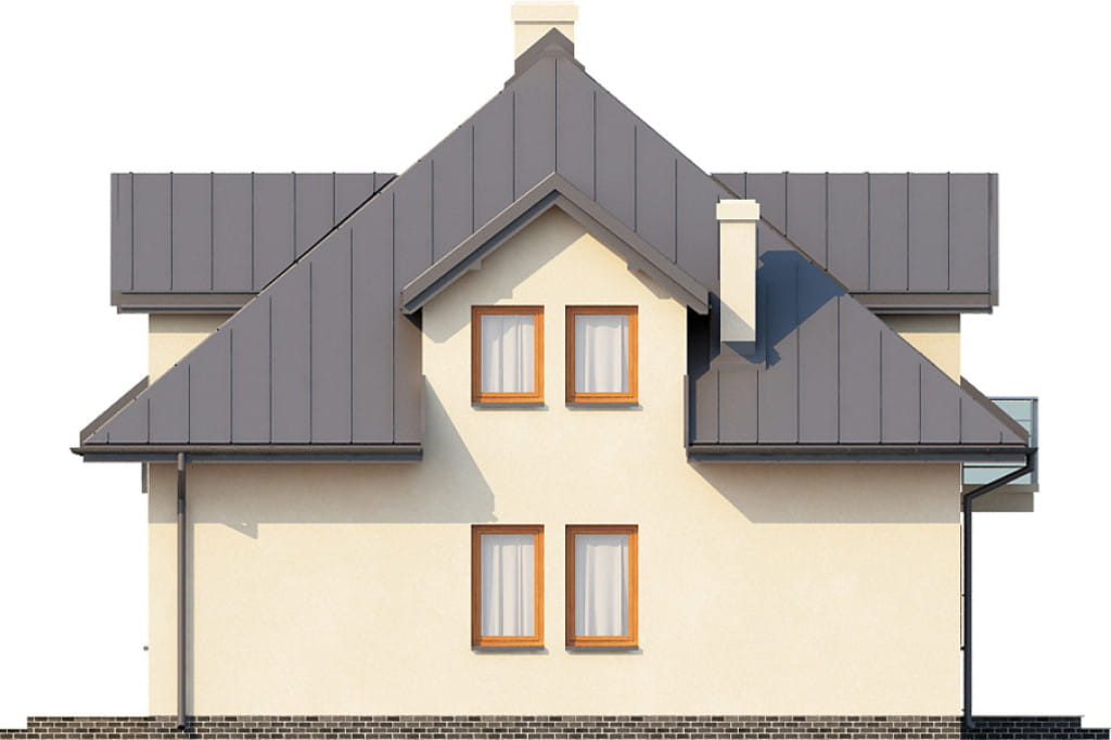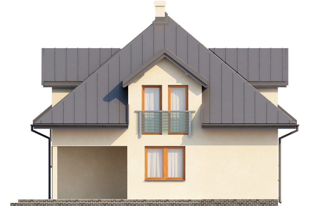 Bryła domu na planie kwadratu jest przykryta eleganckim czterospadowym dachem, w którym wzrok przyciągają jaskółki w elewacji frontowej i ogrodowej. Na parterze warto zwrócić uwagę na niewielki taras ulokowany w części ogrodowej domu. Jest on w całości zadaszony, dzięki czemu będzie doskonałym miejscem do wypoczynku nawet w deszczowe dni. Zwarta bryła sprawia, że Piekary 2 można realizować na działkach o szerokości od 18m.