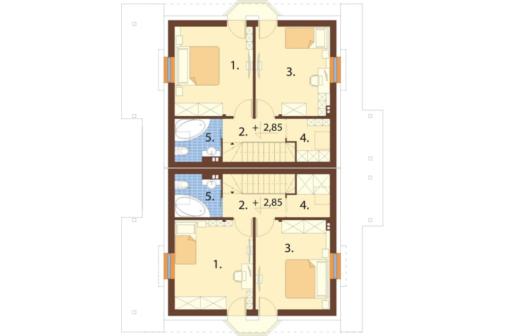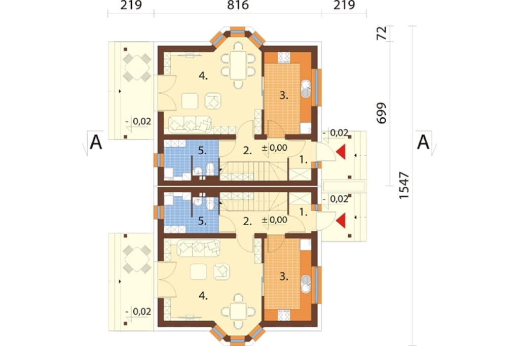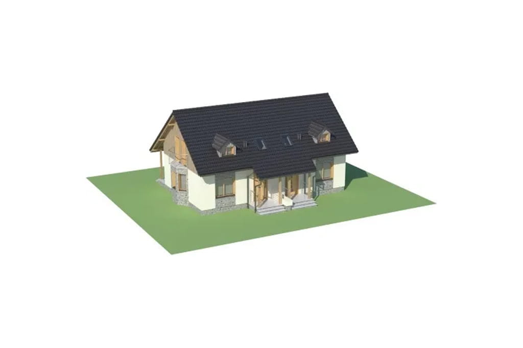Projekt domu w zabudowie bliźniaczej, cechujący się przytulnym charakterem i stosunkowo niewielką powierzchnią użytkową. Budynek z zewnątrz wygląda jak wolnostojący dom jednorodzinny, jednak wnętrze zostało podzielone na dwie, odrębne jednostki, dające poczucie intymności i prywatności. Swój tradycyjny charakter zawdzięcza dwuspadowemu dachowi oraz stosunkowo prostemu kształtowi. Niewątpliwym urozmaiceniem są dwa wykusze umieszczone po przeciwległych stronach obiektu oraz lukarny i świetliki w połaci dachu. Mimo niewielkich gabarytów, doskonale spełni potrzeby użytkowników.